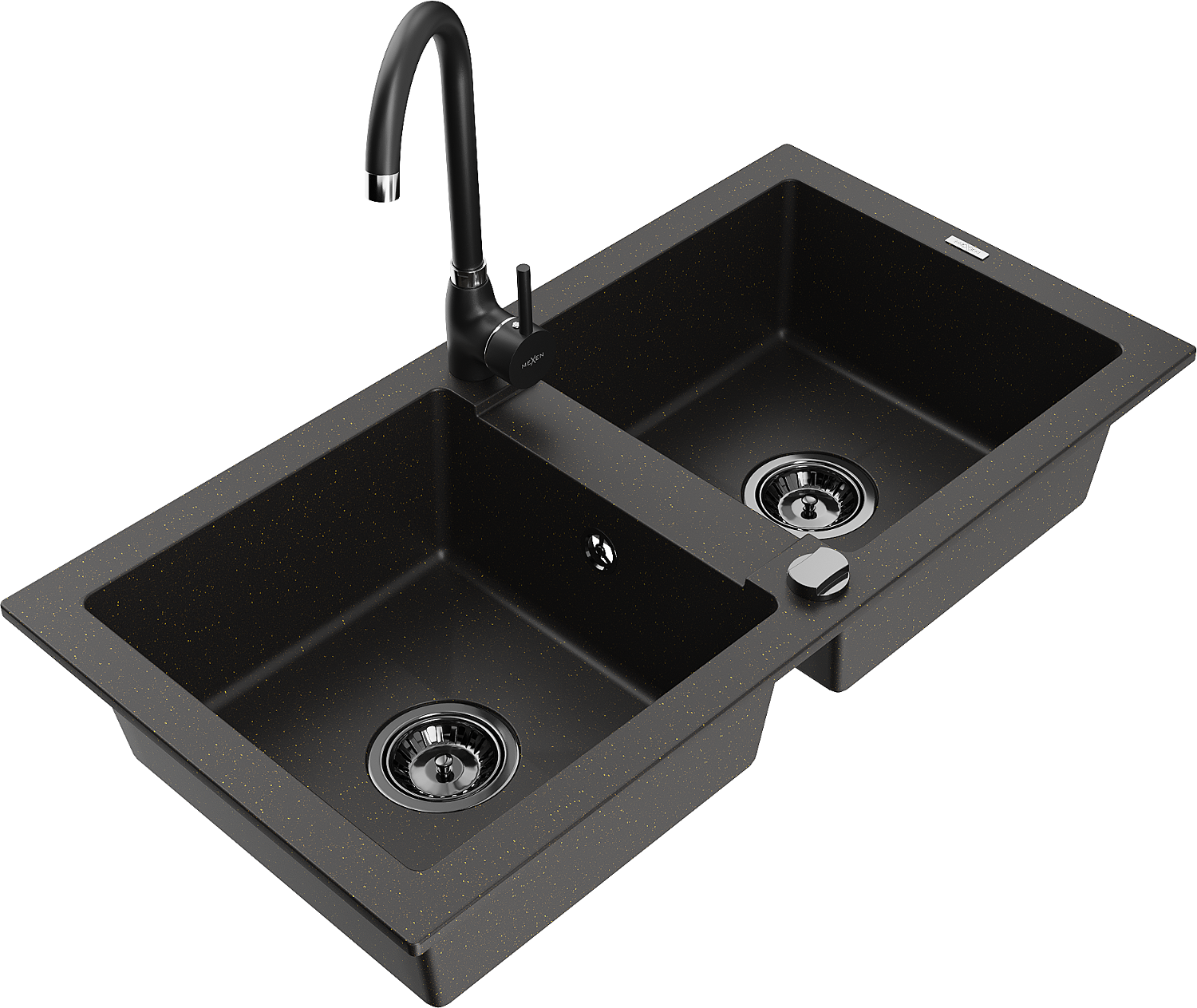 Mexen Mario granite sink 2-bowl with Telma kitchen tap, black/gold - 6504-75-670200-70-B