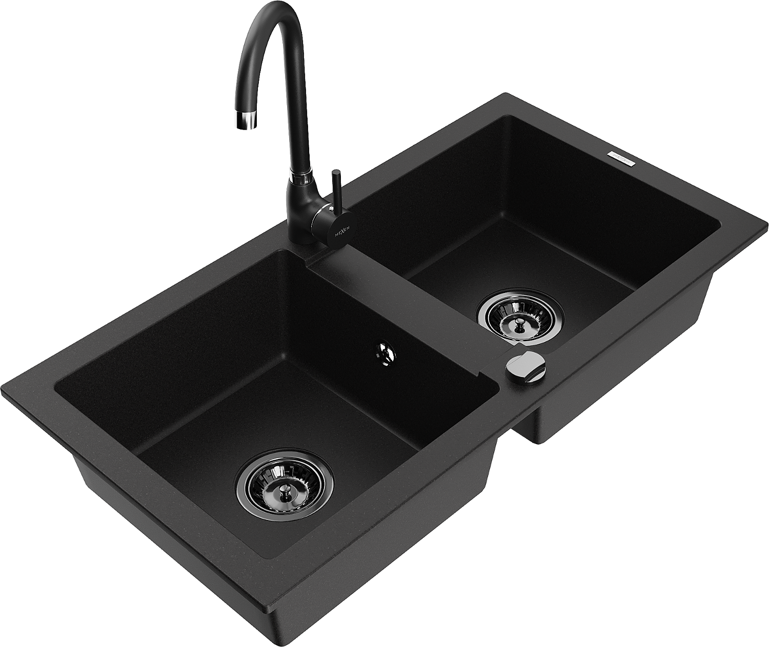 Mexen Mario granite sink 2-bowl with Telma kitchen tap, black - 6504-77-670200-70-B