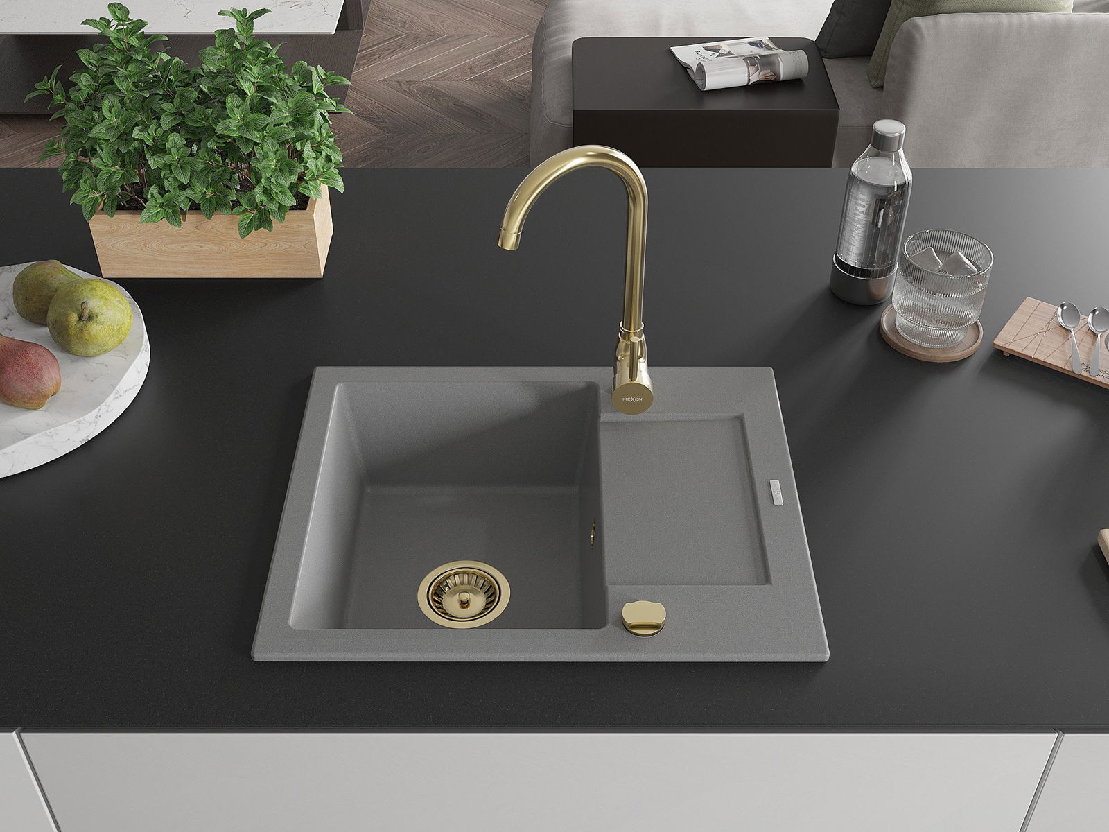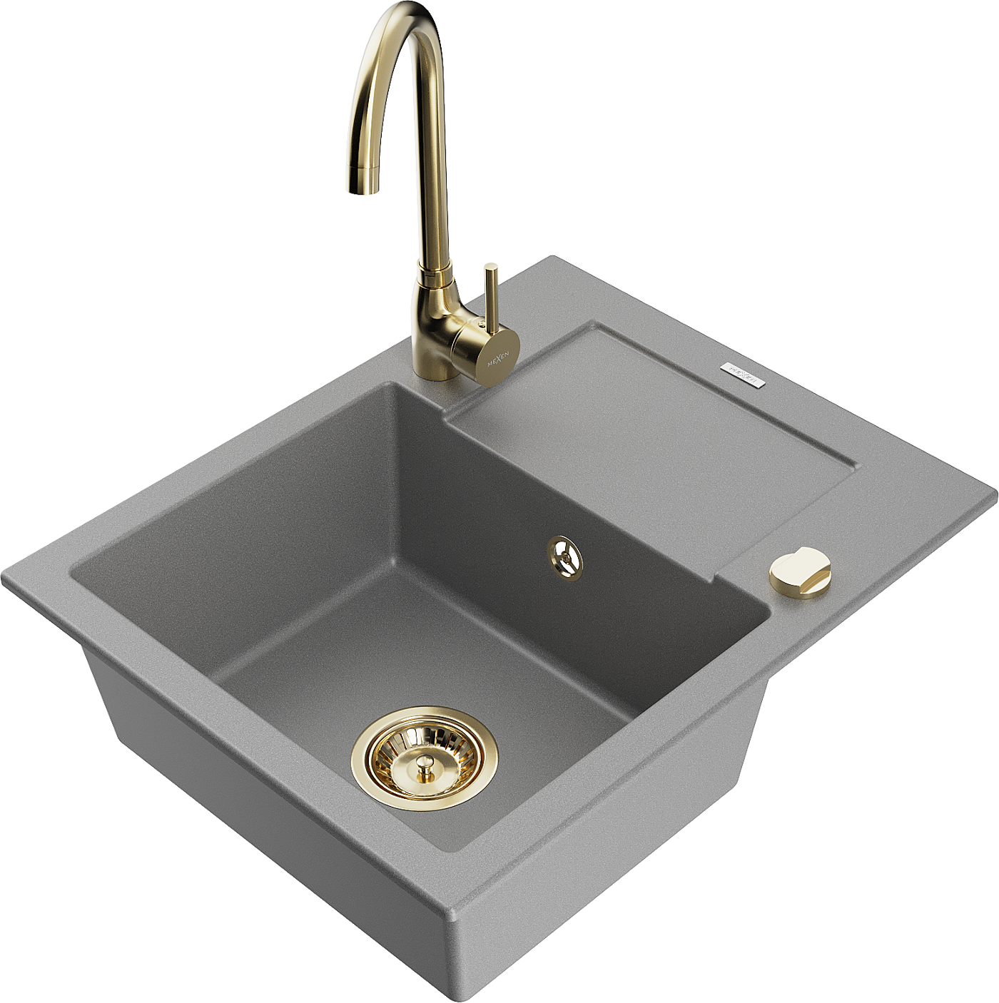 Mexen Enzo 1-bowl granite kitchen sink with drainer and Telma kitchen tap, grey - 6506-71-670200-50