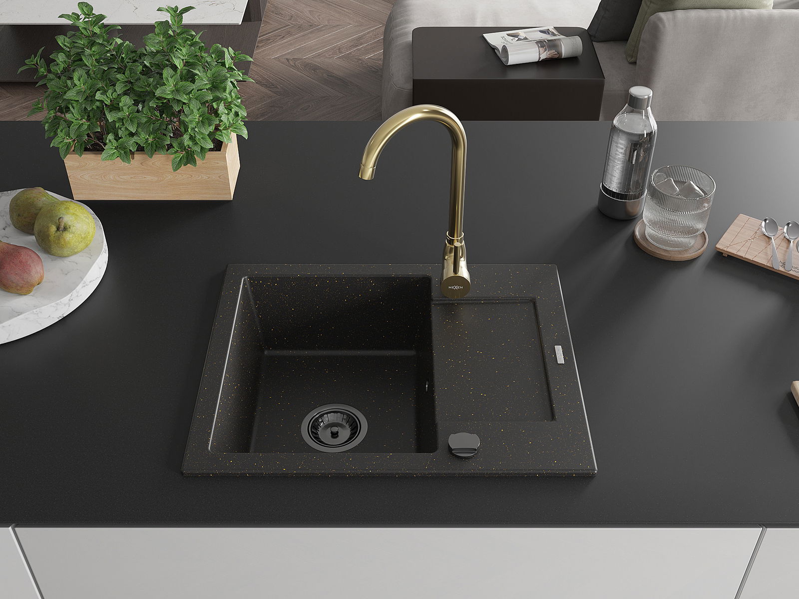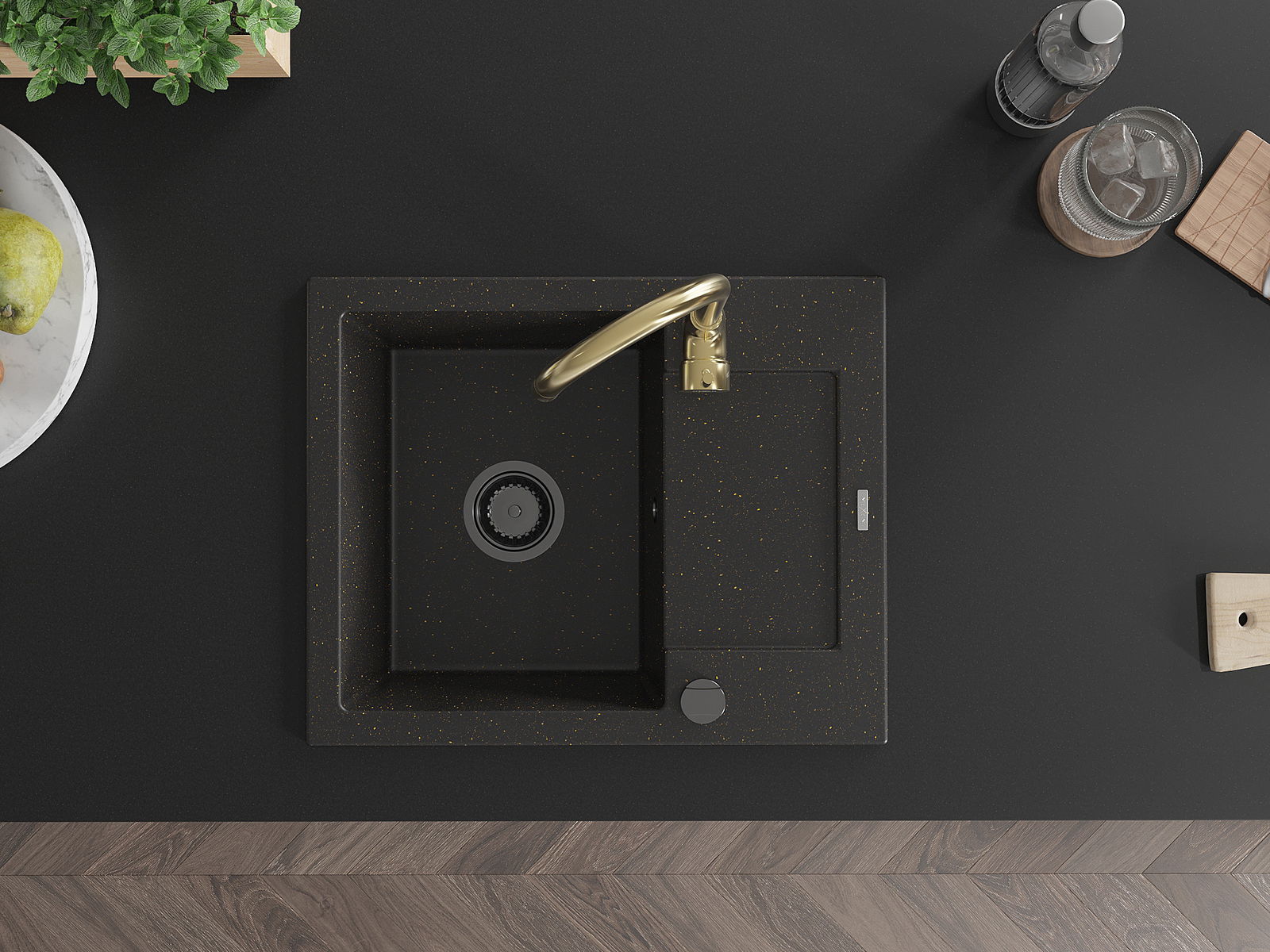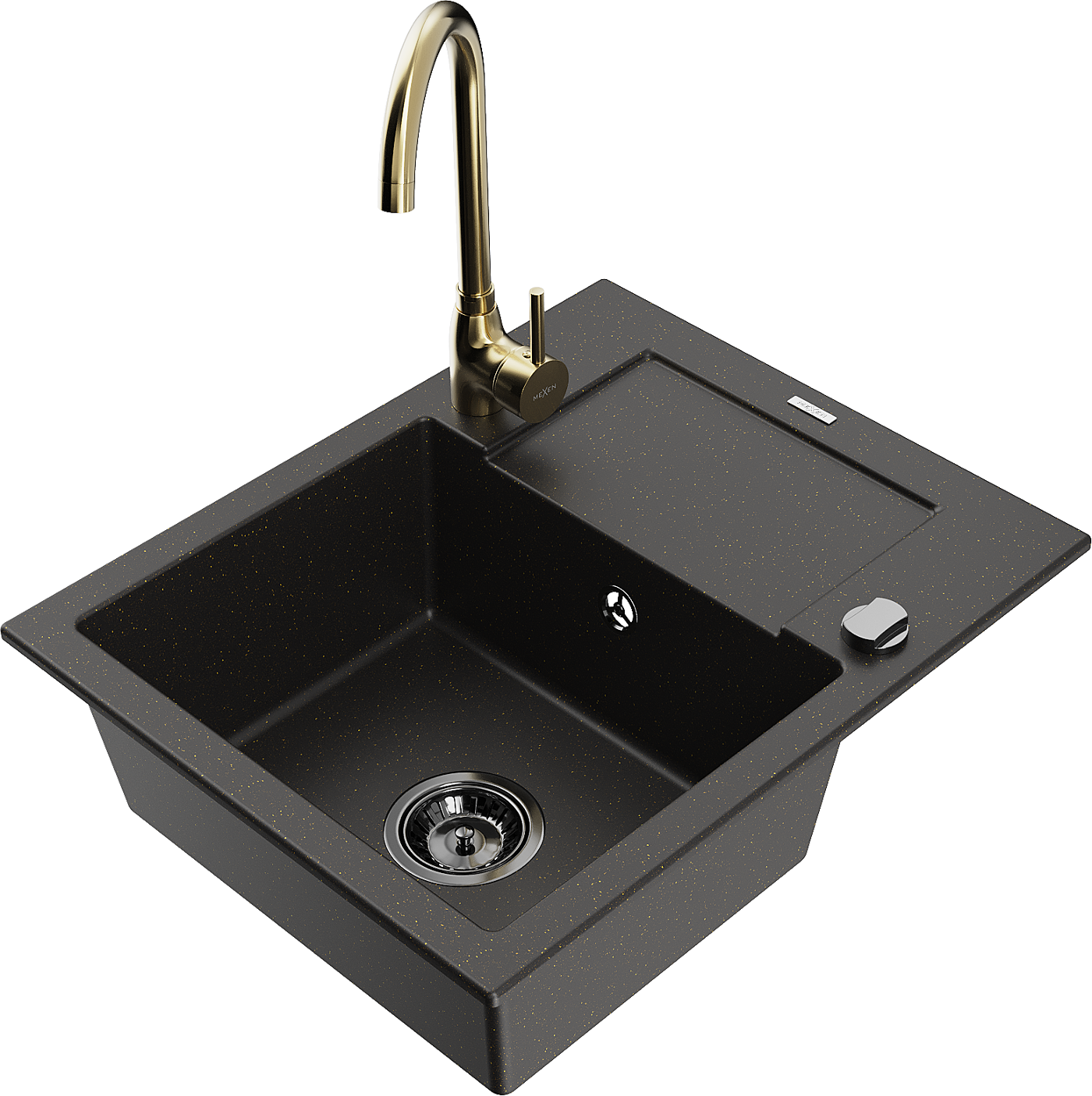 Mexen Enzo granite sink 1-bowl with drainer and Telma kitchen tap, black/gold - 6506-75-670200-50-B