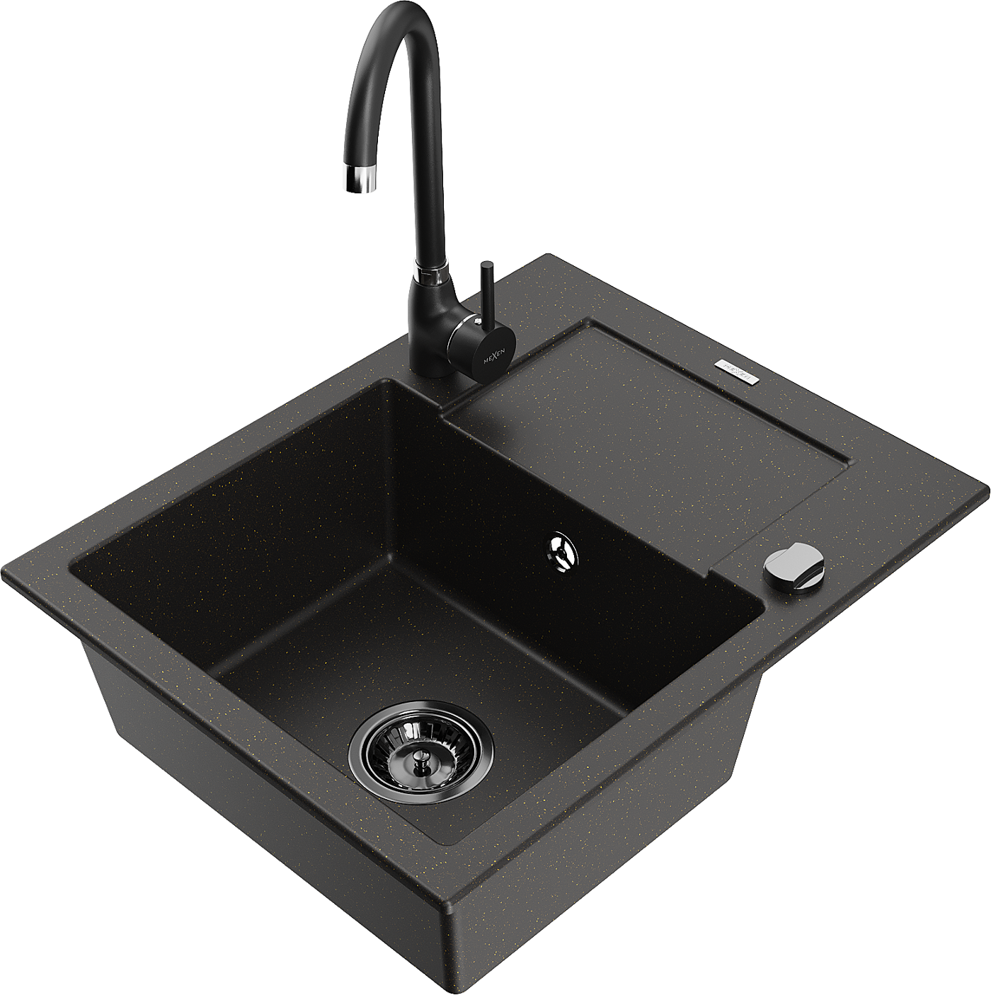 Mexen Enzo granite sink 1-bowl with drainer and Telma kitchen tap, black/gold - 6506-75-670200-70-B