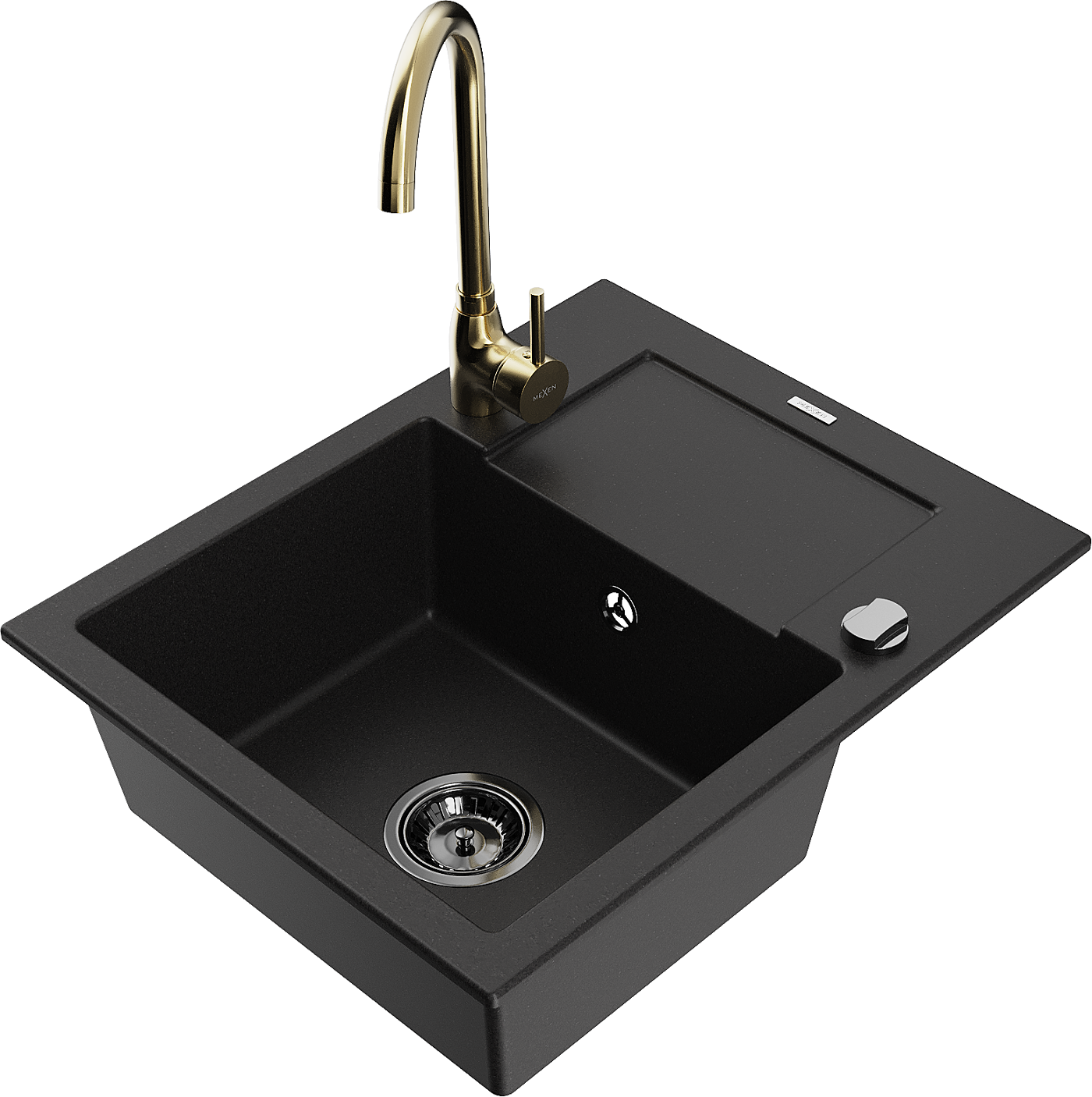 Mexen Enzo granite kitchen sink 1-bowl with drainer and Telma kitchen tap, black - 6506-77-670200-50-B
