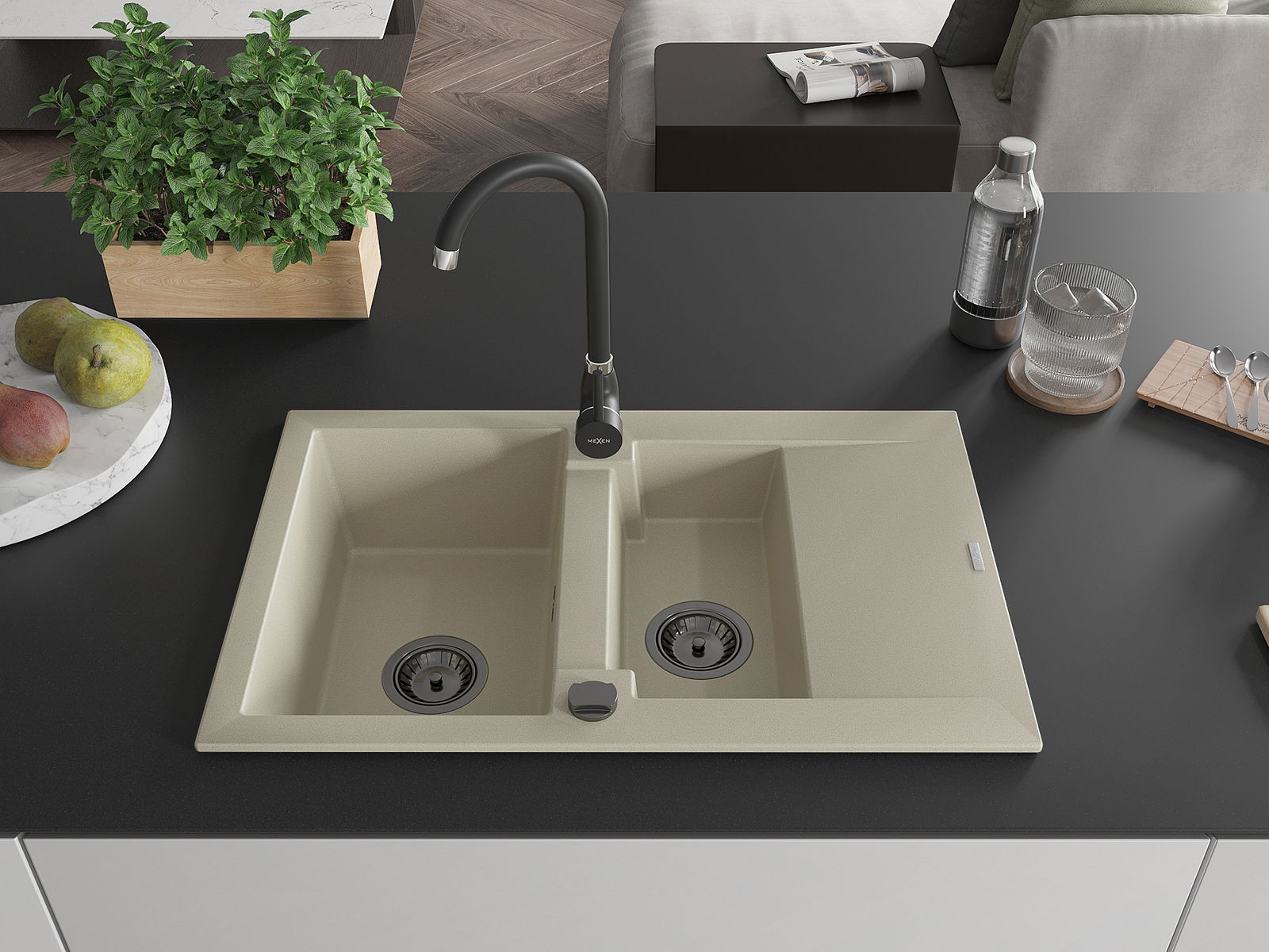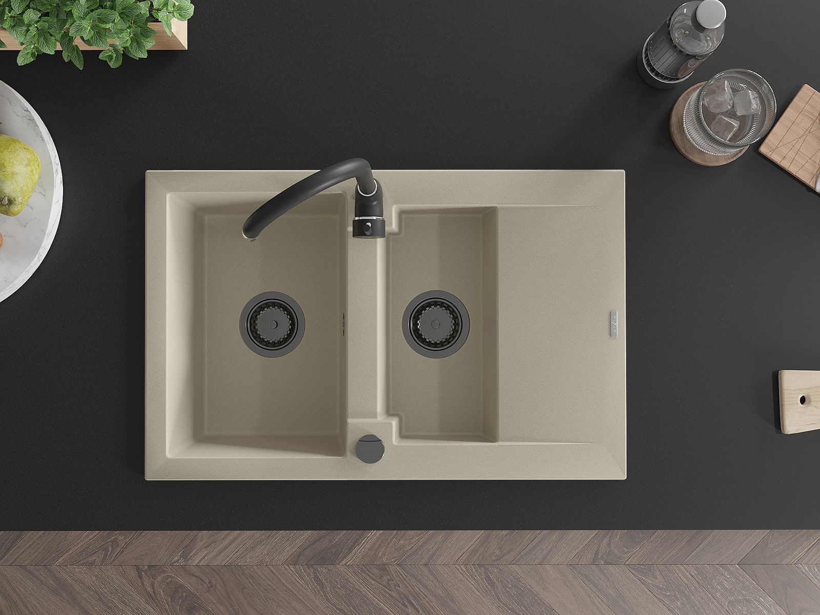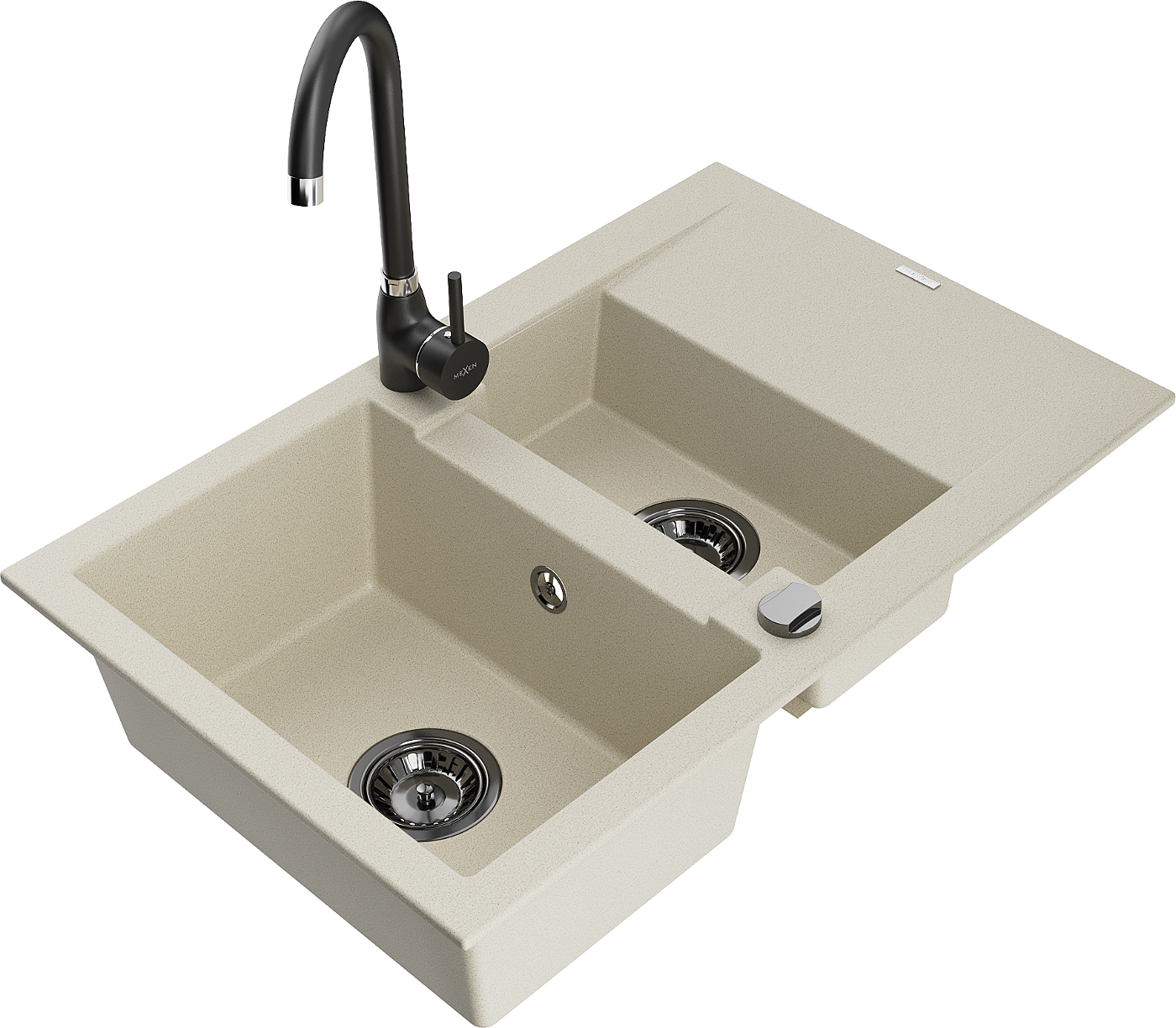Mexen Gaspar granite sink 1.5-bowl with drainer and Telma kitchen tap, beige - 6507-69-670200-70