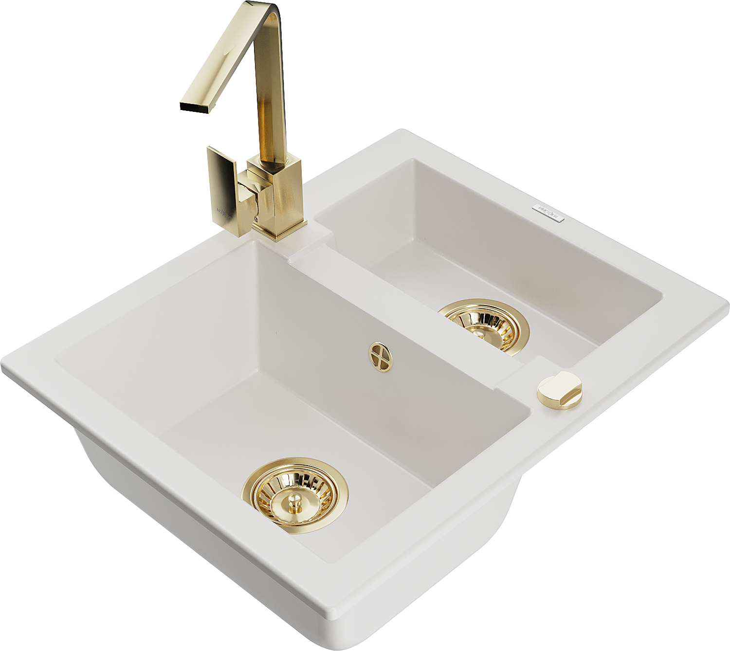 Mexen Carlos 1.5-bowl granite sink with Rita kitchen tap, white - 6518-20-670300-50