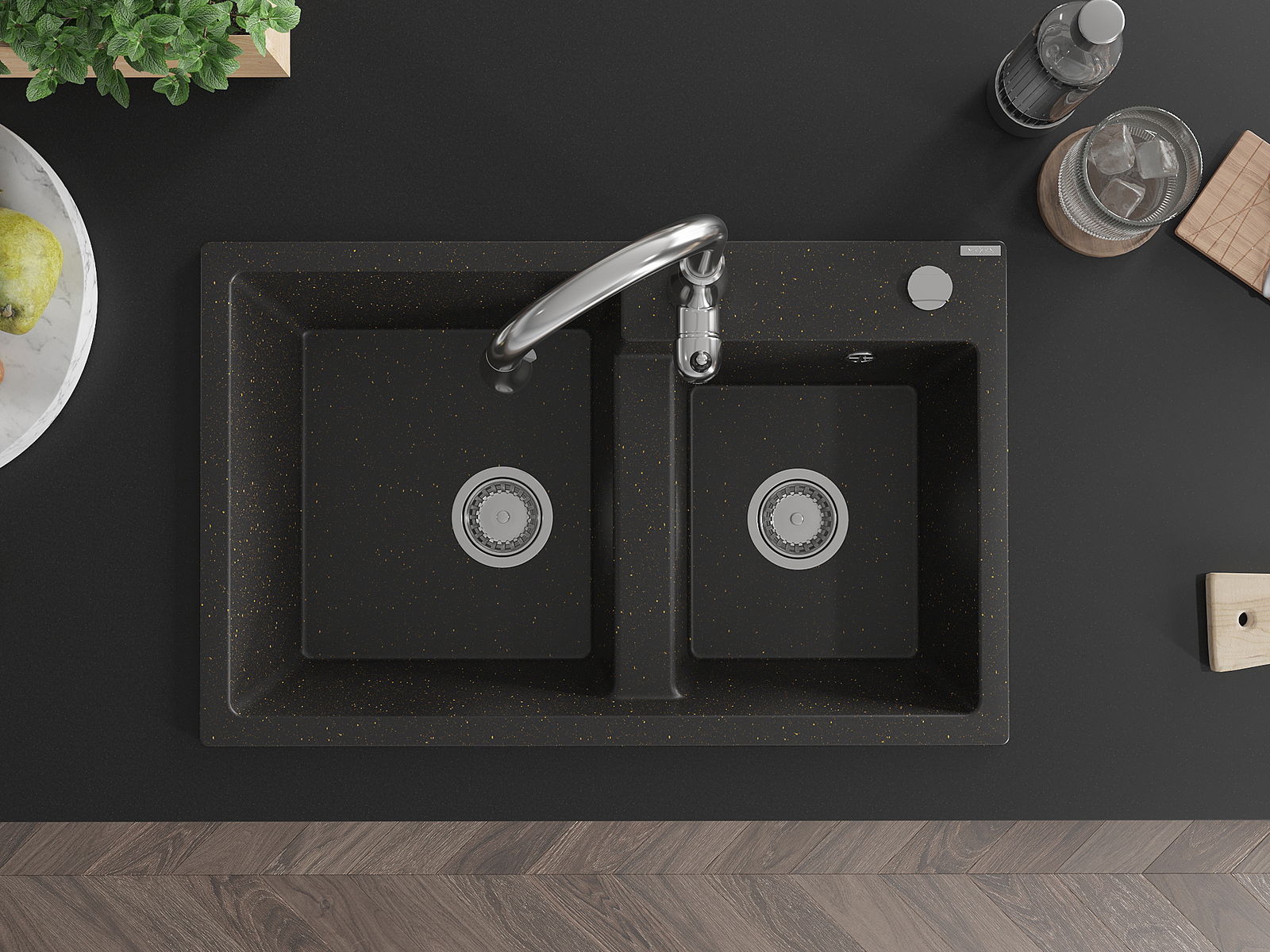 Mexen Tomas granite sink 2-bowl with Savita kitchen tap, black/gold metallic - 6516-75-672601-00