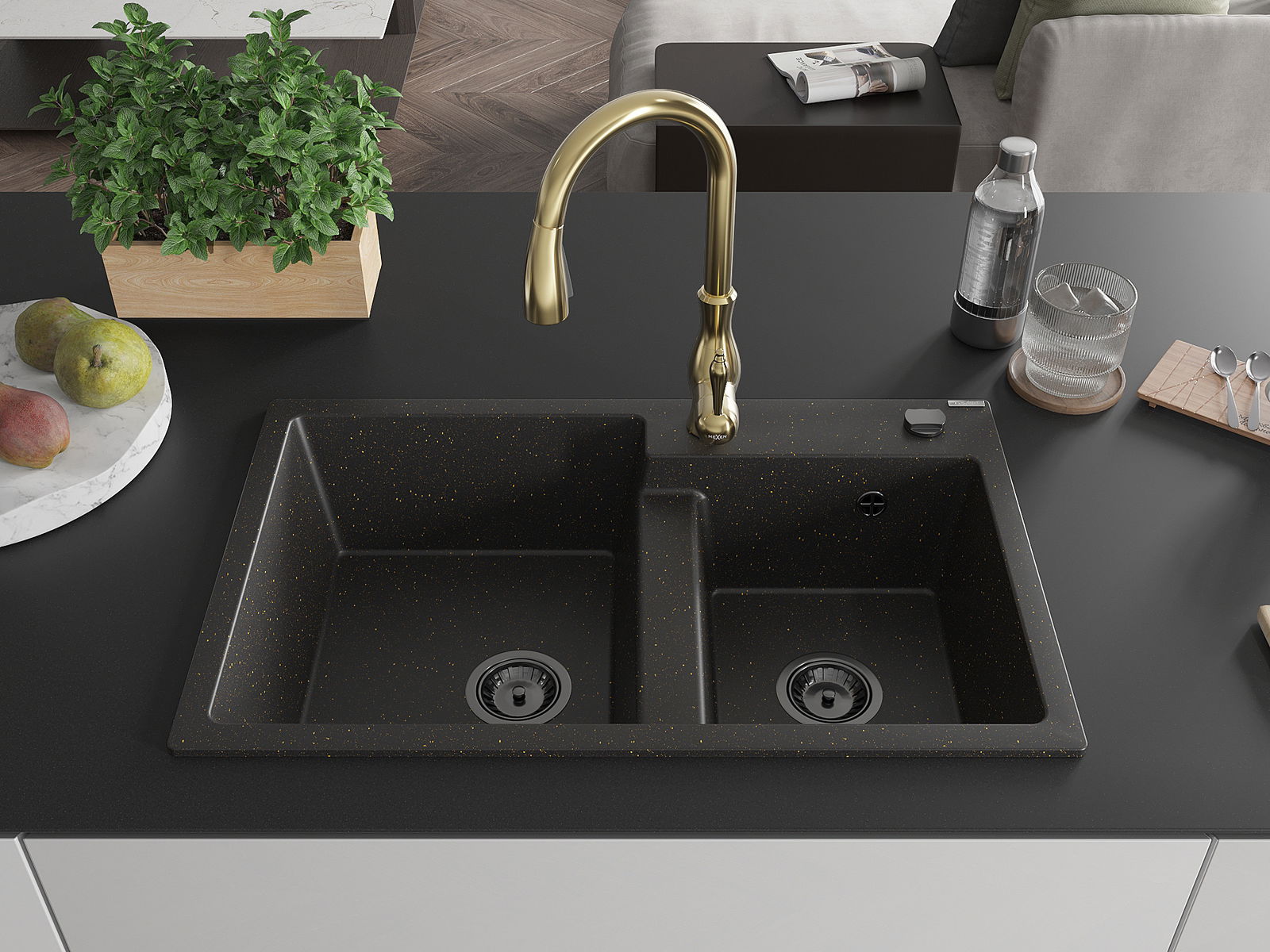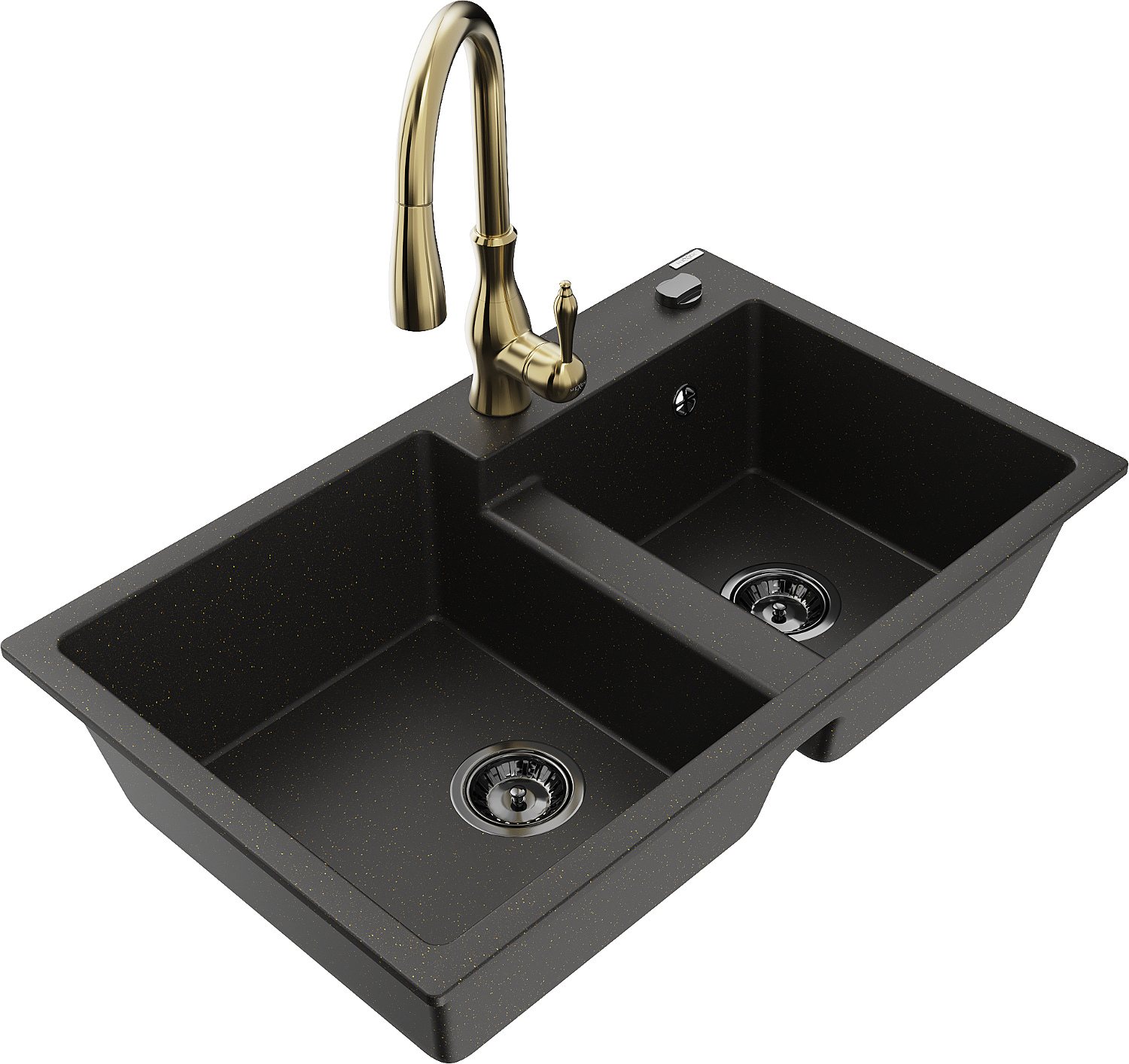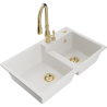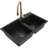 Mexen Tomas granite kitchen sink 2-bowl with Savita kitchen tap, black/gold metallic - 6516-75-672601-50-B
