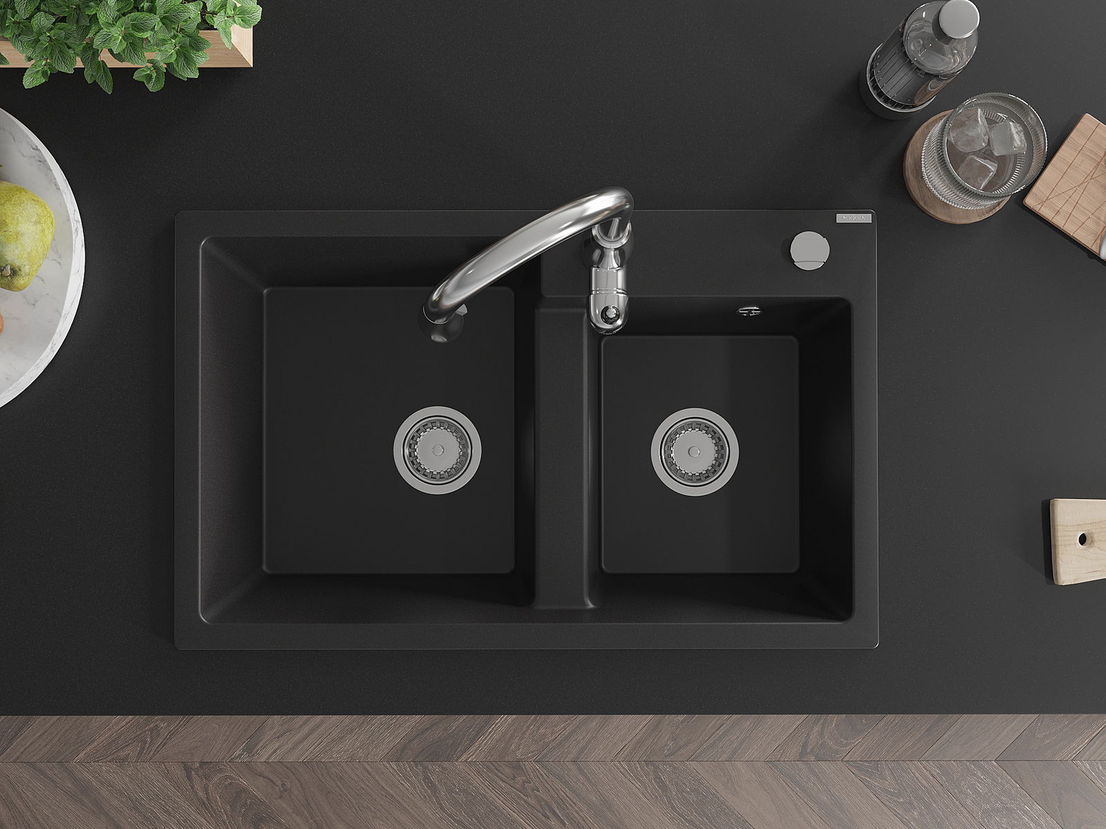 Mexen Tomas granite sink double bowl with Savita kitchen tap, black - 6516-77-672601-00