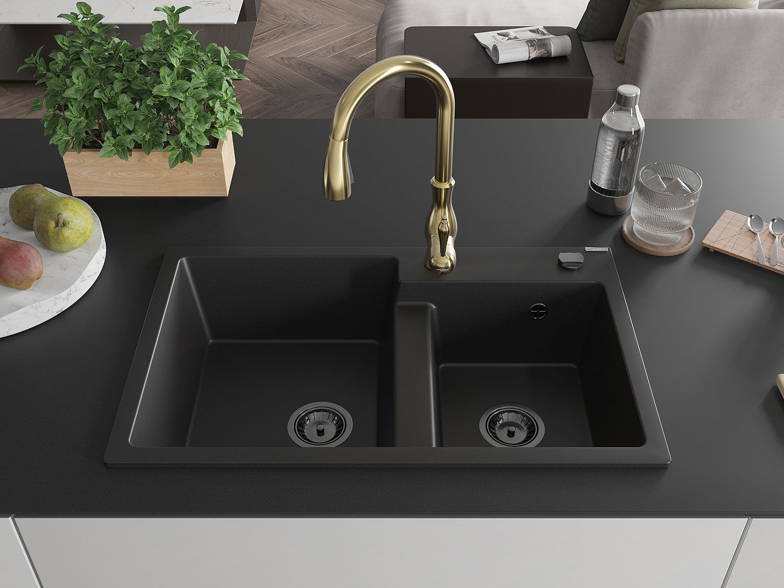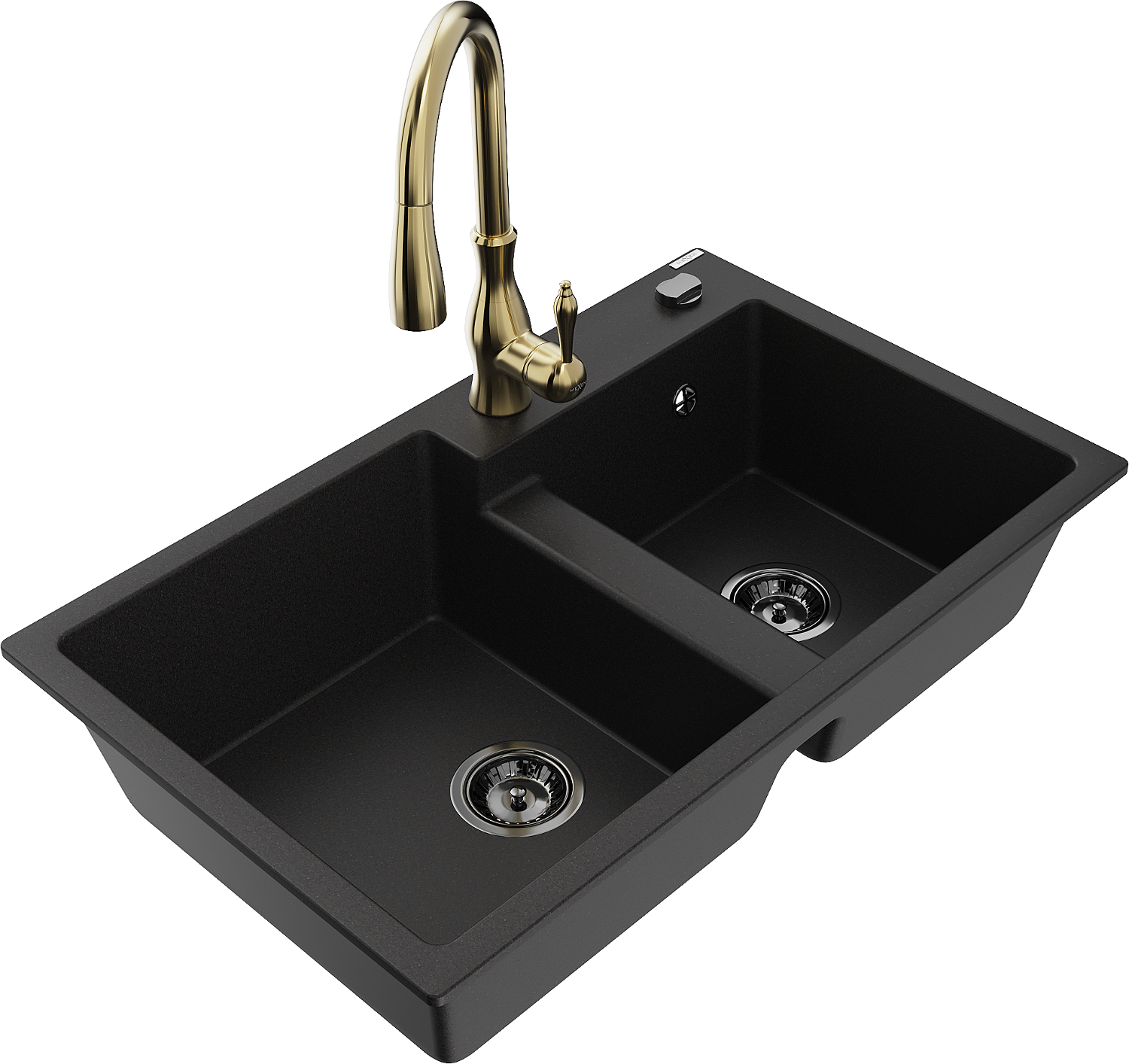 Mexen Tomas granite sink 2-chamber with Savita kitchen tap, black - 6516-77-672601-50-B