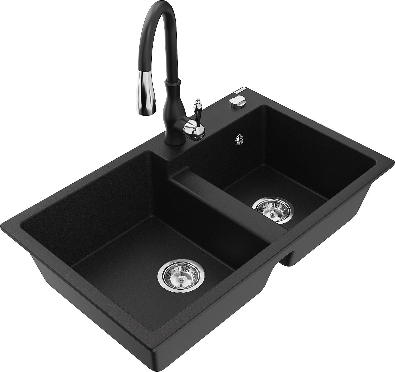 Mexen Tomas granite 2-bowl sink with Savita kitchen tap, black - 6516-77-672601-70