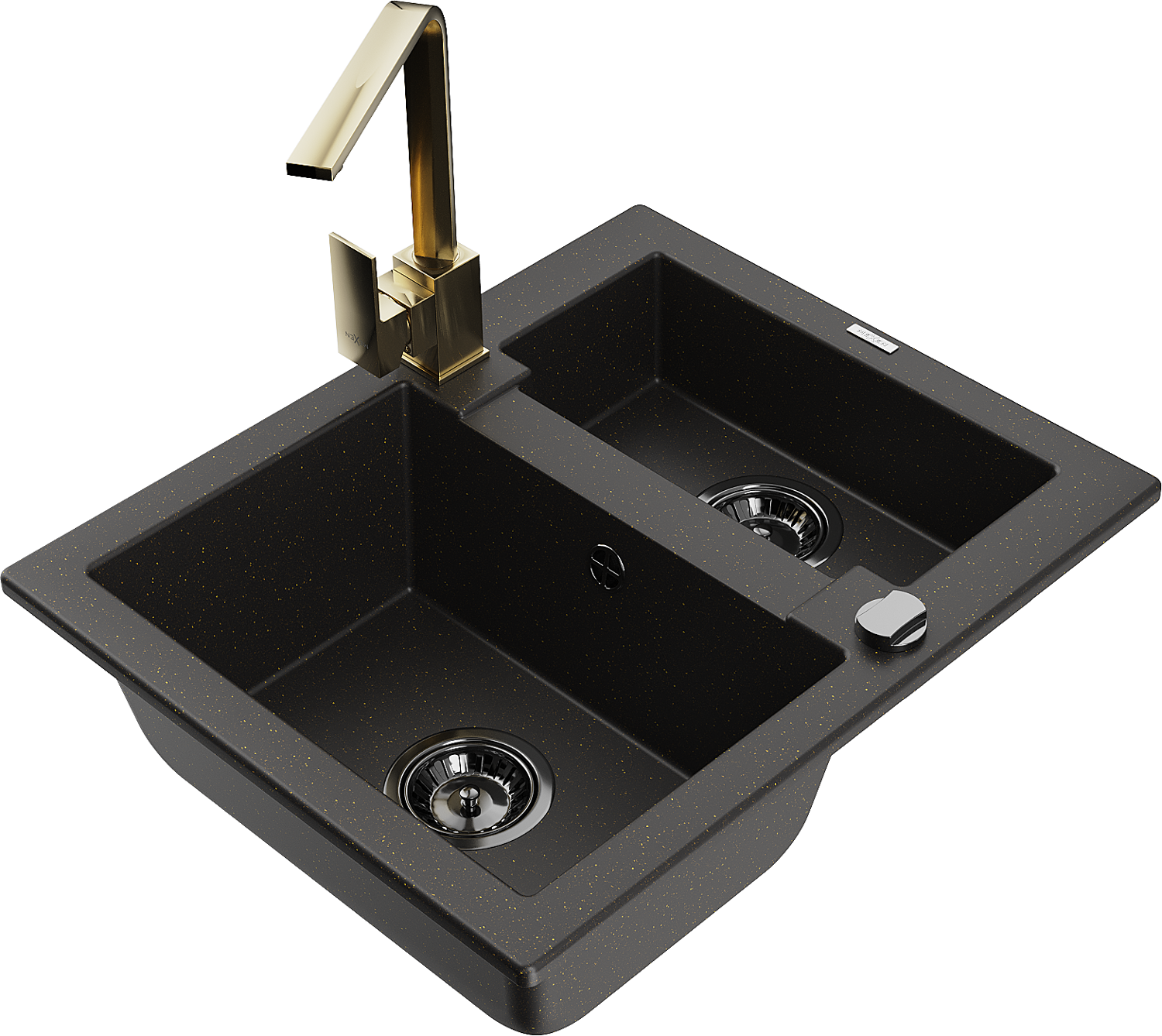 Mexen Carlos granite sink 1.5-bowl with Rita kitchen tap, black/gold metallic - 6518-75-670300-50-B