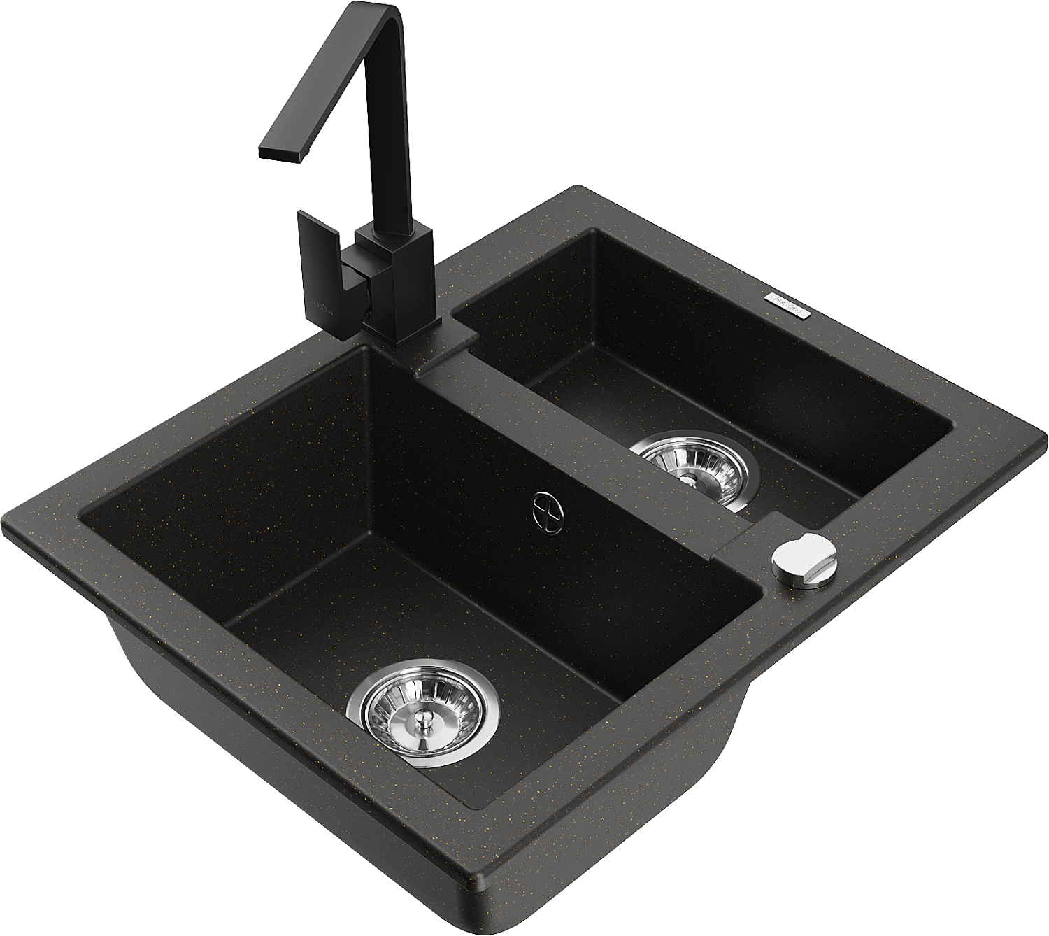 Mexen Carlos 1.5-bowl granite sink with Rita kitchen tap, black/golden metallic - 6518-75-670300-70
