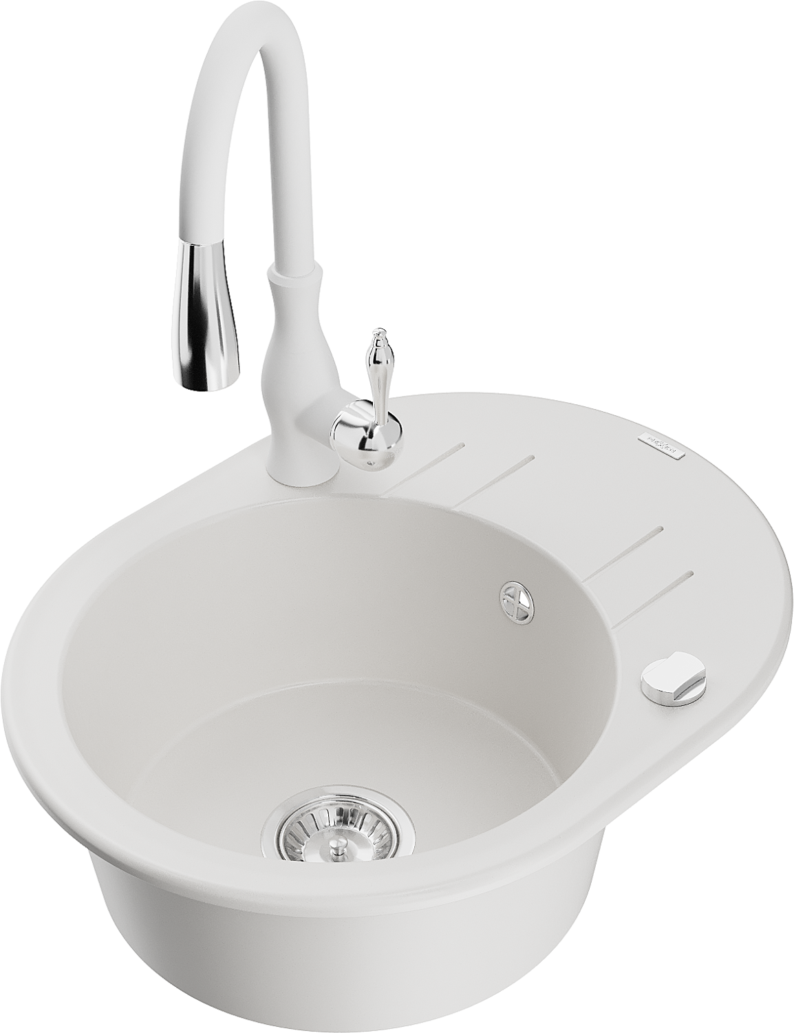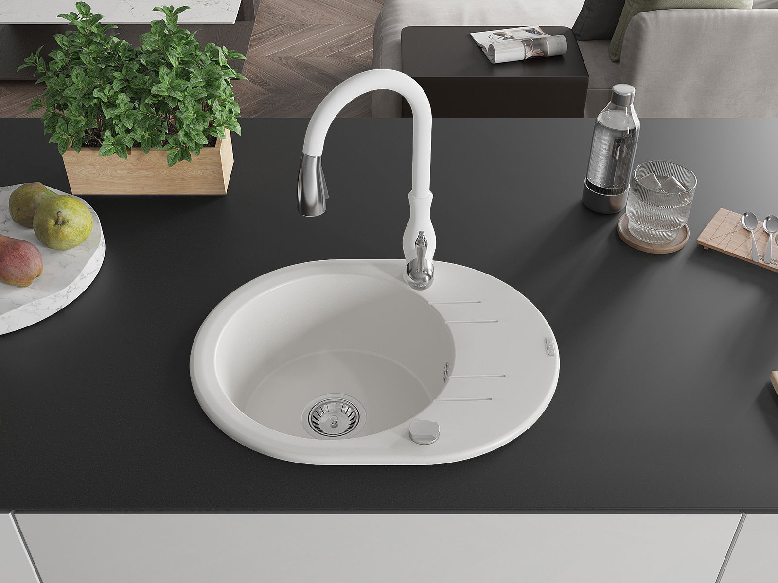 Mexen Kevin 1-bowl granite sink with drainer and Savita kitchen tap, white - 6517-20-672601-20
