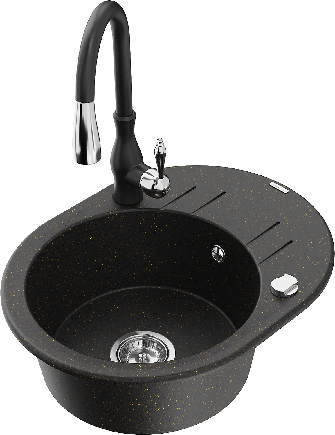 Mexen Kevin 1-bowl granite sink with drainer and Savita kitchen tap, black/gold metallic - 6517-75-672601-70