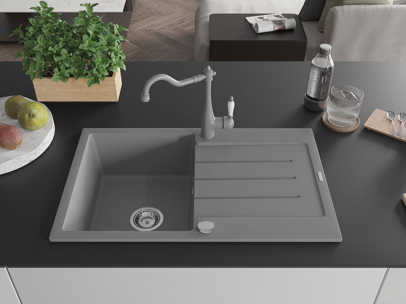 Mexen Bruno granite sink 1-bowl with drainer and Carla kitchen tap, grey - 6513-71-670700-71
