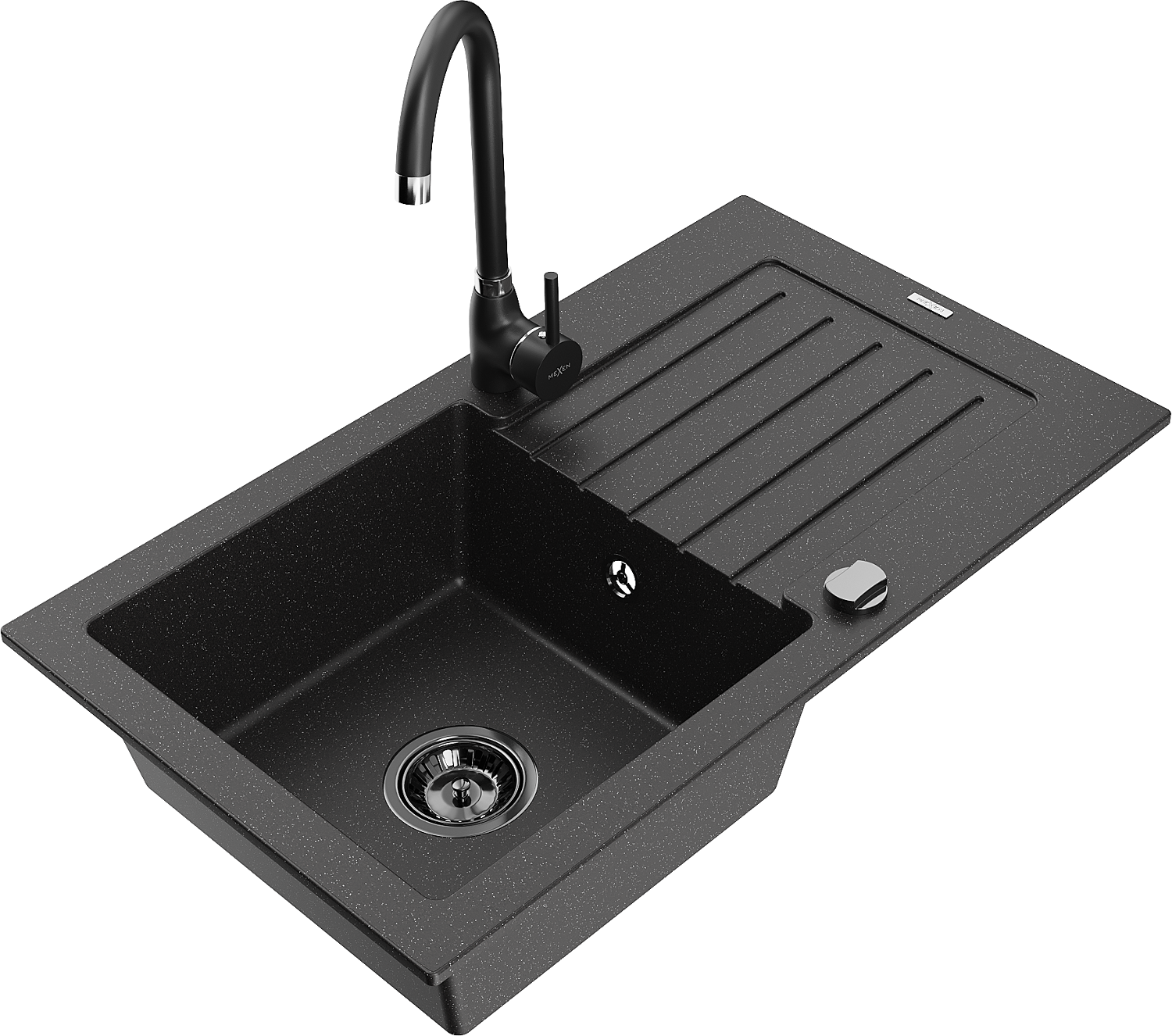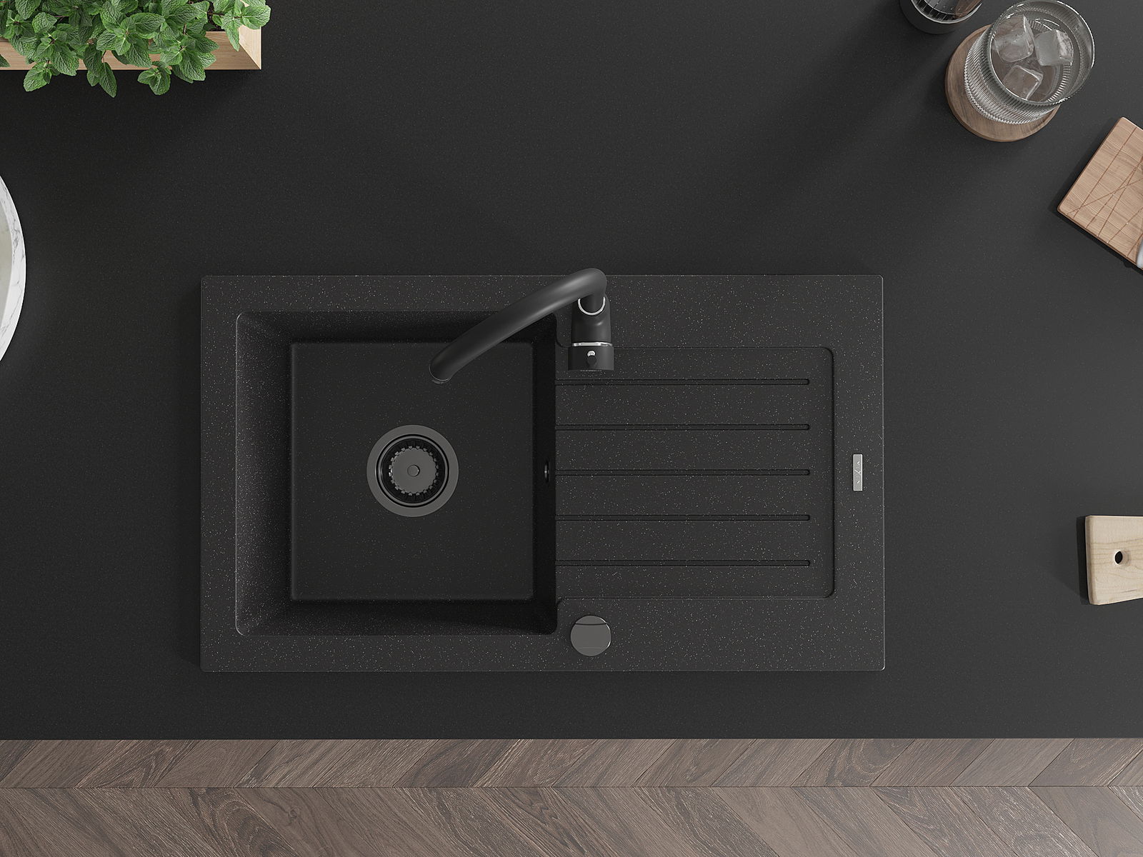 Mexen Pablo granite sink 1-bowl with drainer and Telma kitchen tap, black/silver - 6510-73-670200-70-B