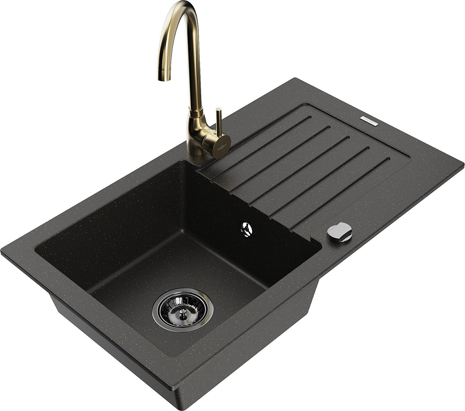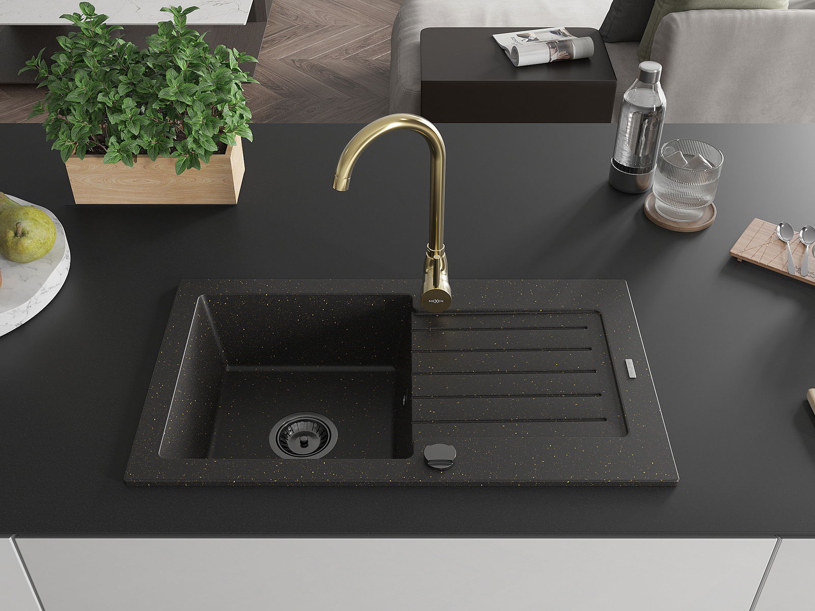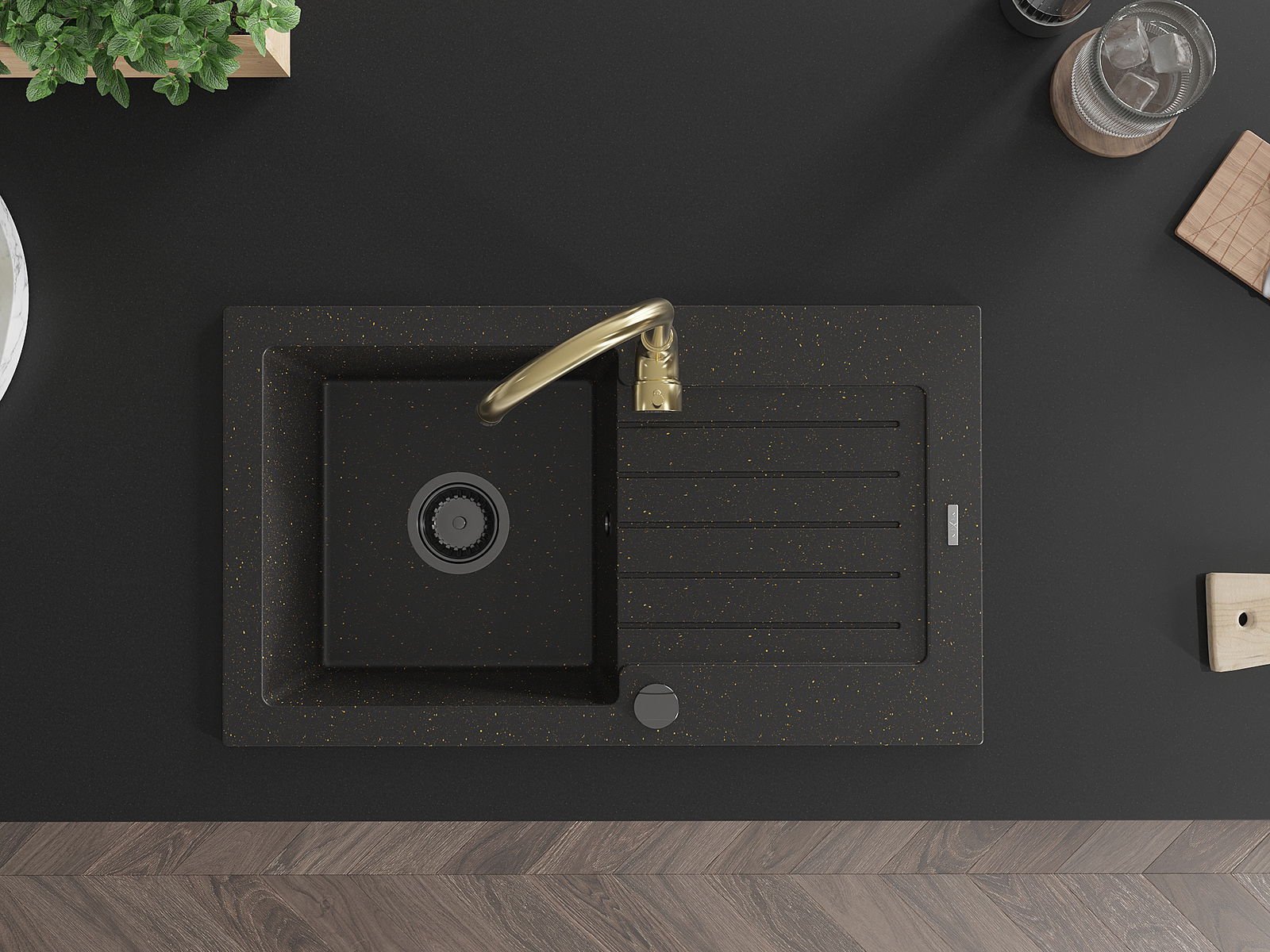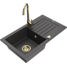 Mexen Pablo granite sink 1-bowl with drainer and Telma kitchen tap, black/gold - 6510-75-670200-50-B