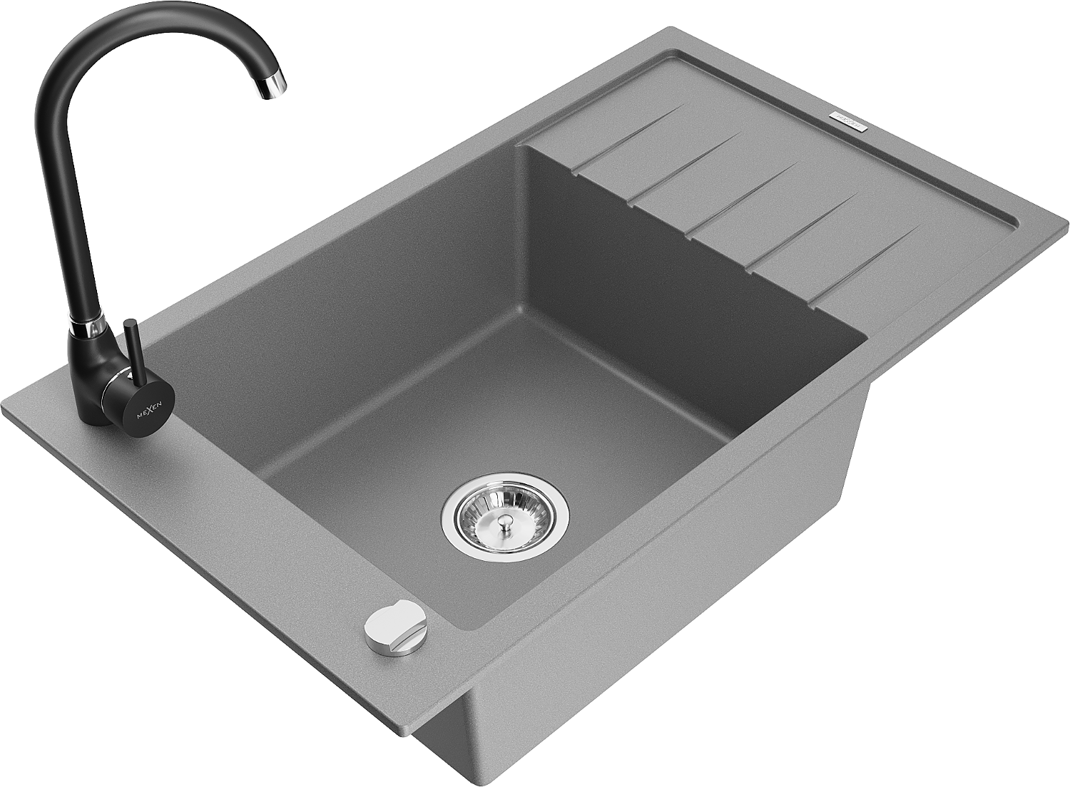 Mexen Elias granite sink 1-bowl with drainer and Telma kitchen tap, grey - 6511-71-670200-70