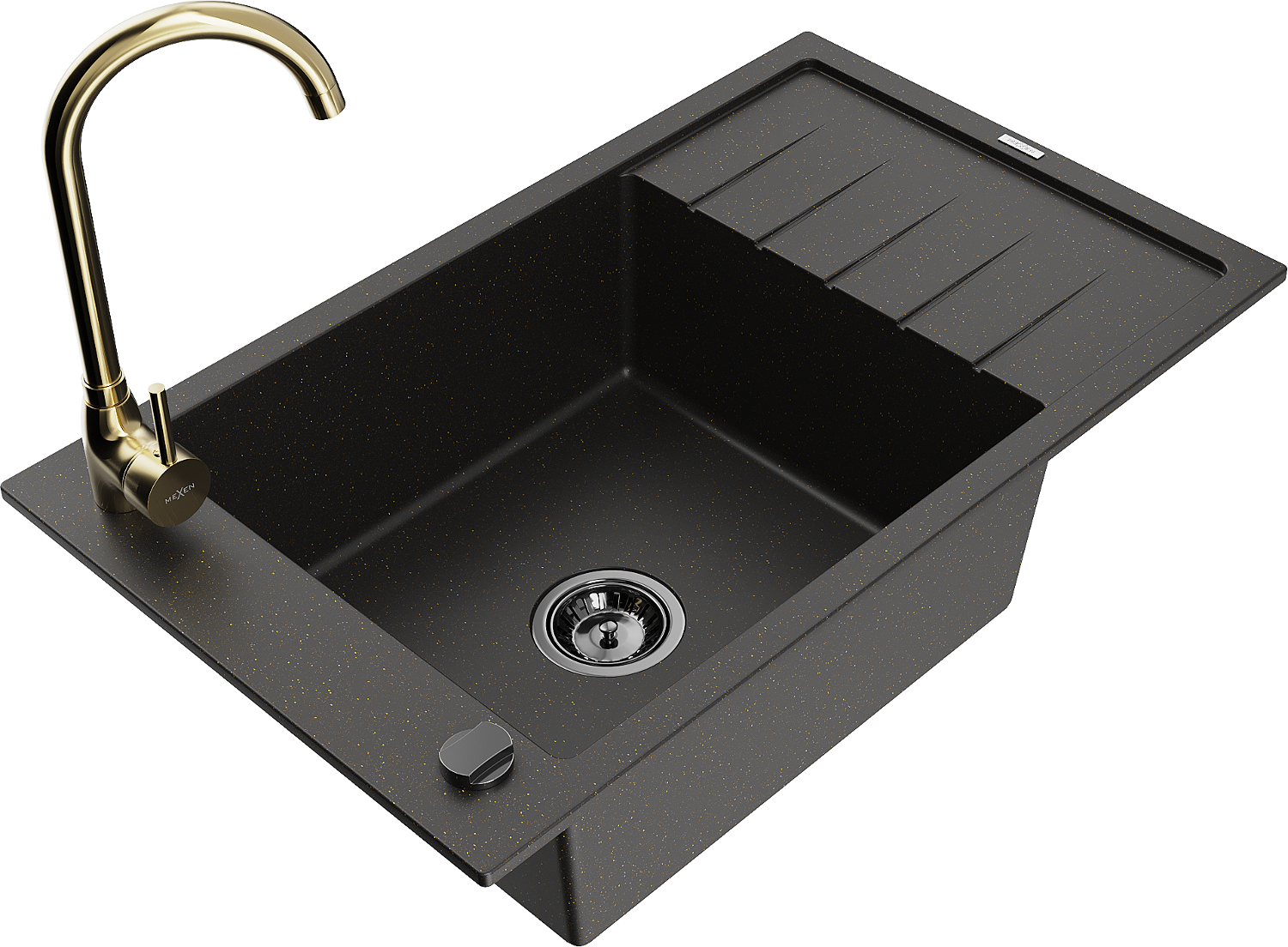 Mexen Elias granite sink 1-bowl with drainer and Telma kitchen tap, black/gold - 6511-75-670200-50-B