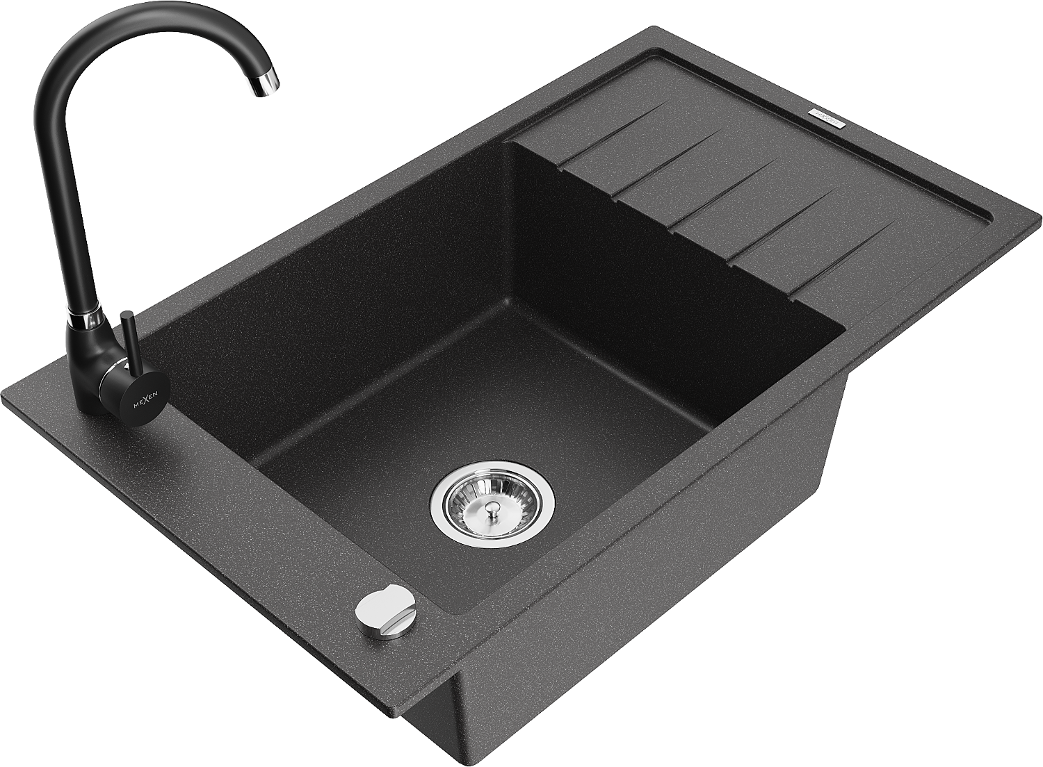 Mexen Elias granite sink 1-bowl with drainer and Telma kitchen tap, black speckled - 6511-76-670200-70