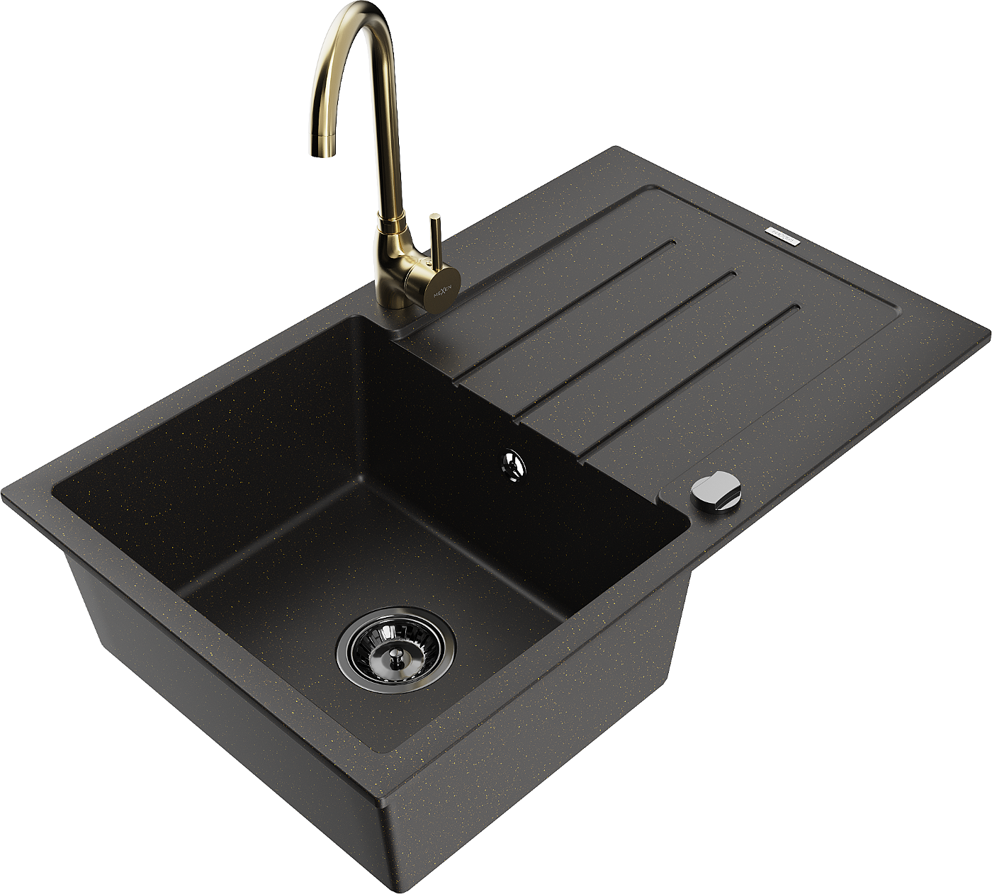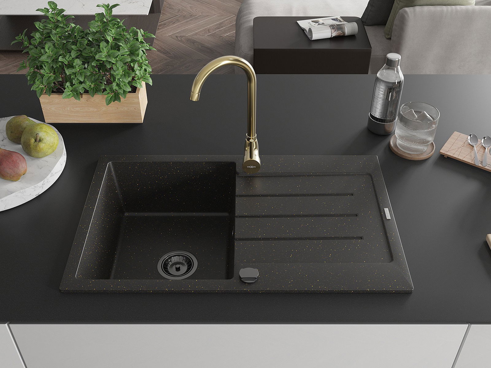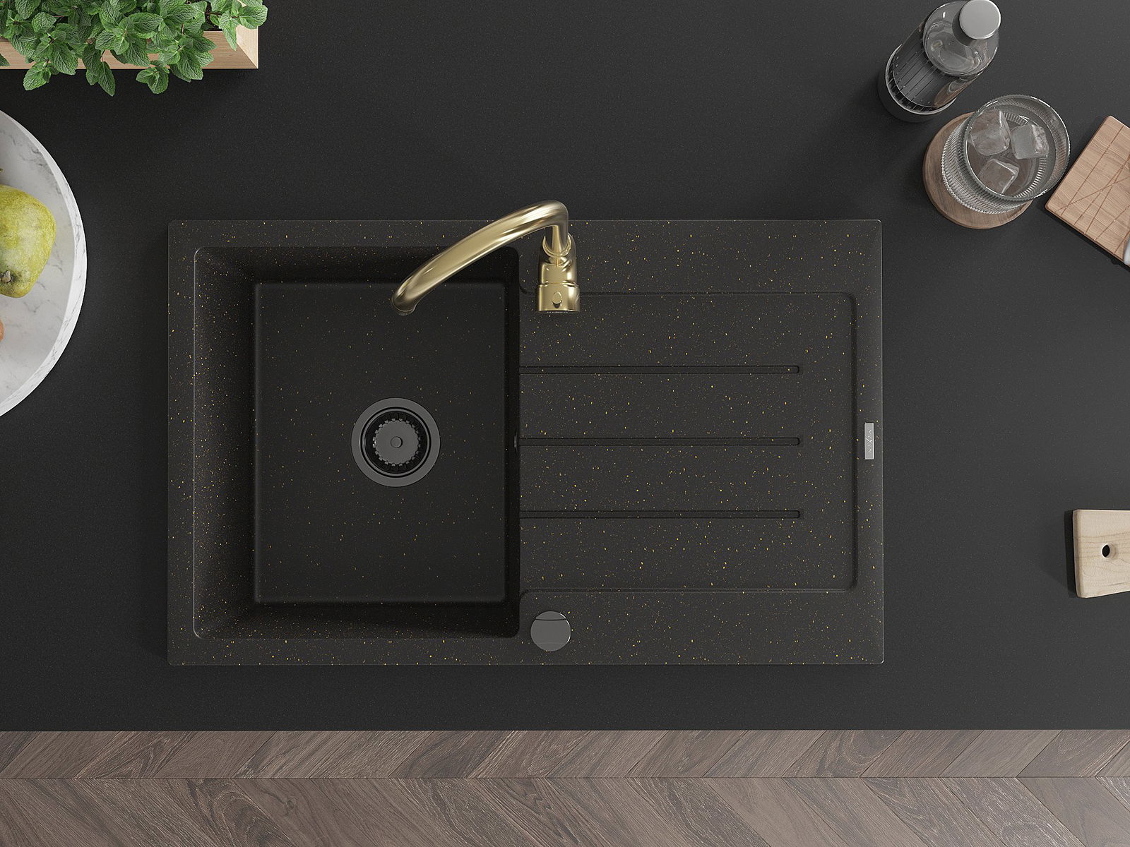 Mexen Bruno 1-bowl granite kitchen sink with drainer and Telma kitchen tap, black/gold - 6513-75-670200-50-B