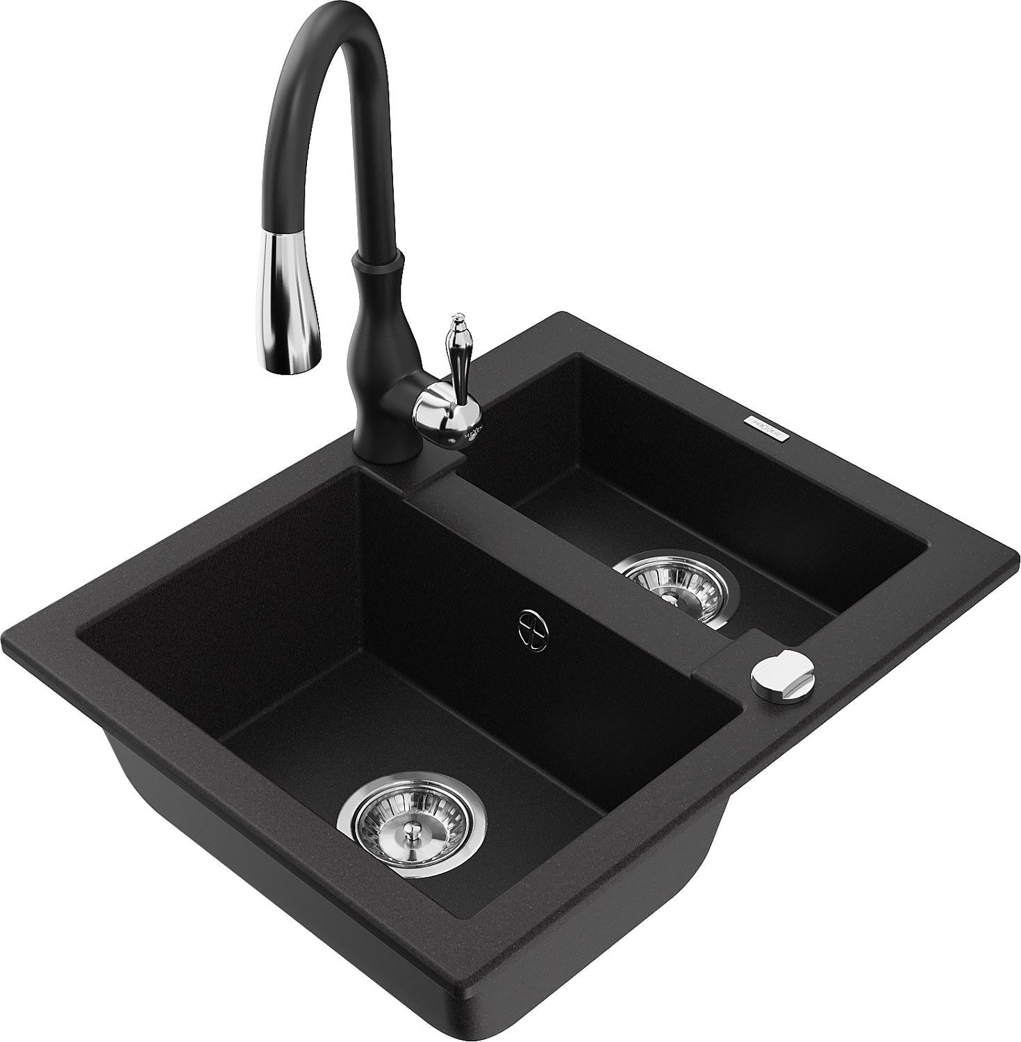Mexen Carlos granite sink 1.5-bowl with Savita kitchen tap, black - 6518-77-672601-70