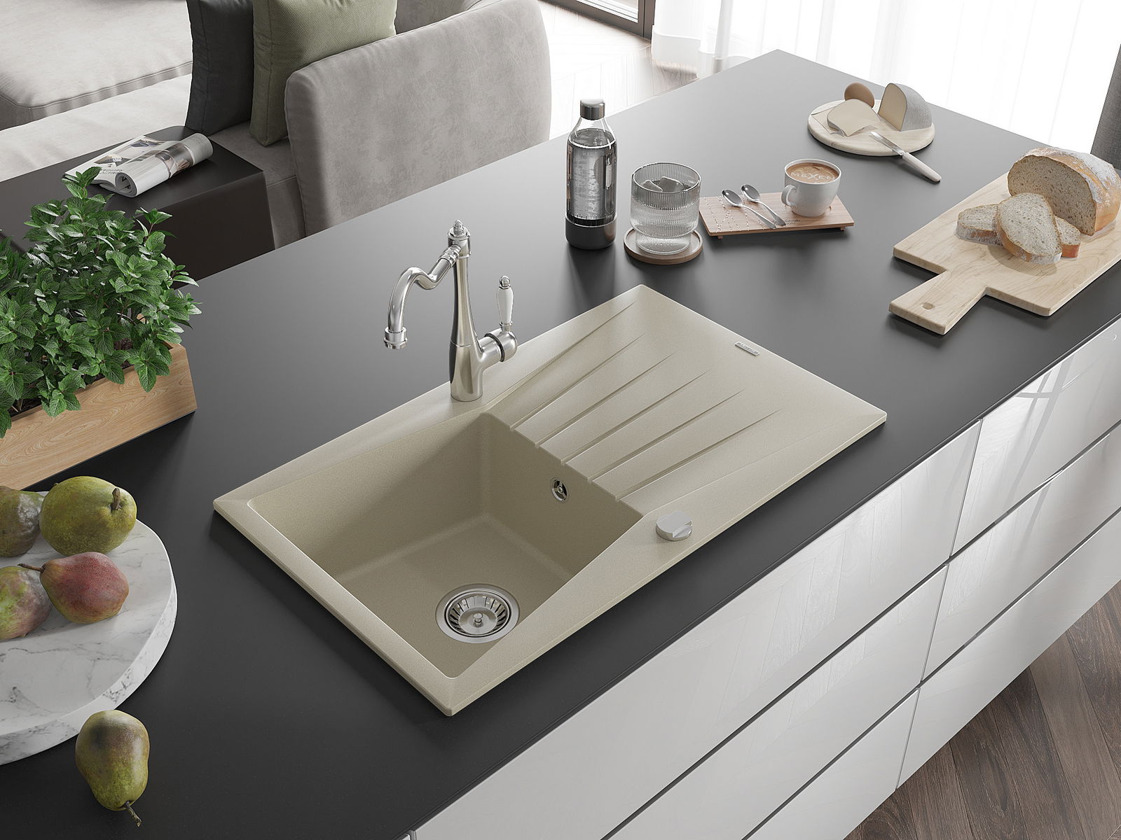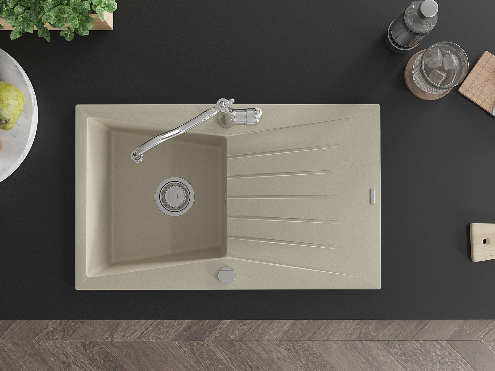 The sink is made of high quality granite. It is an elegant and, above all, practical complement to every kitchen, regardless of its style. High quality and granite durability ensure many years of use.