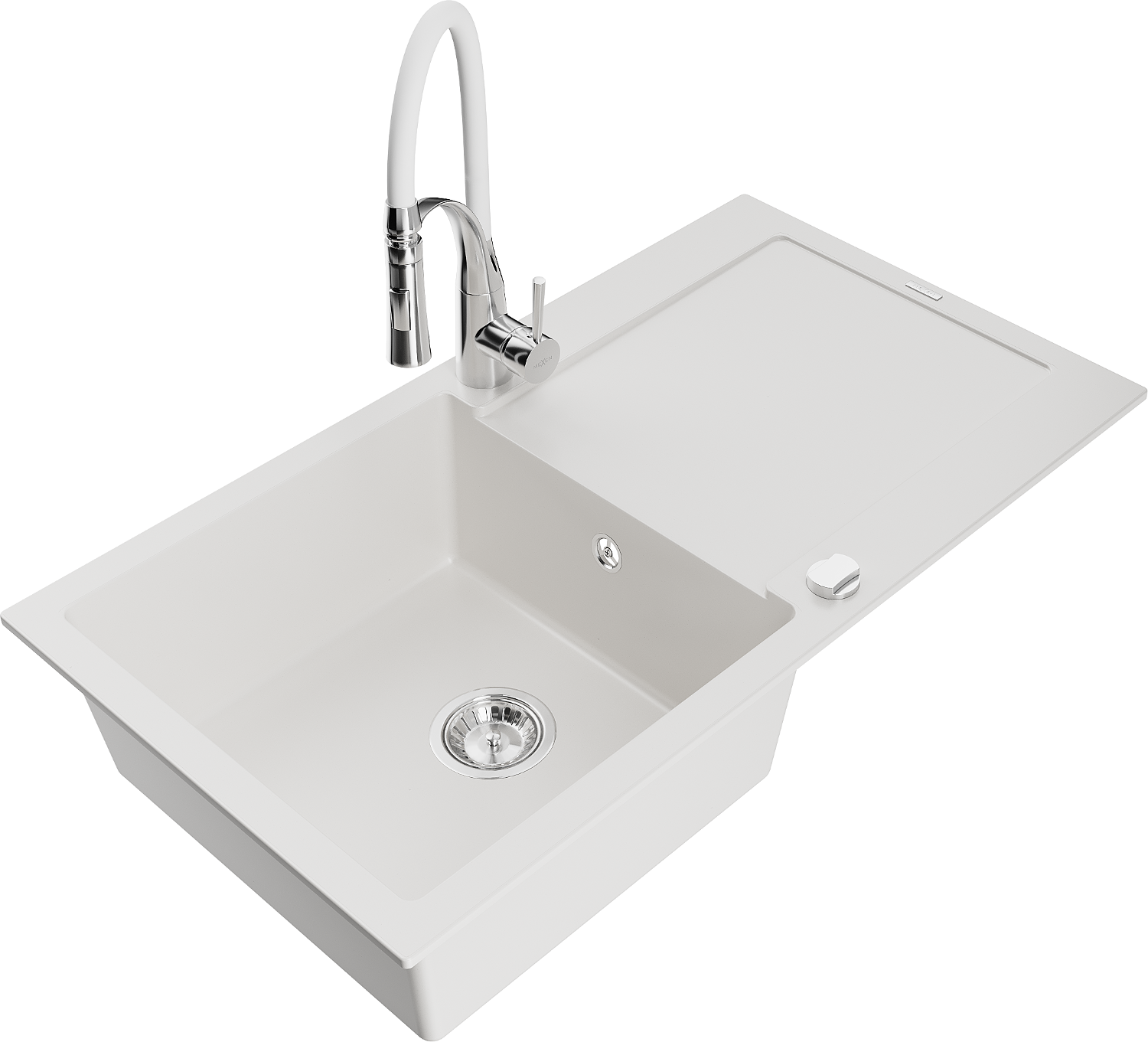 Mexen Leo granite sink 1-bowl with drainer and kitchen tap Aster, white - 6501-20-73450-02