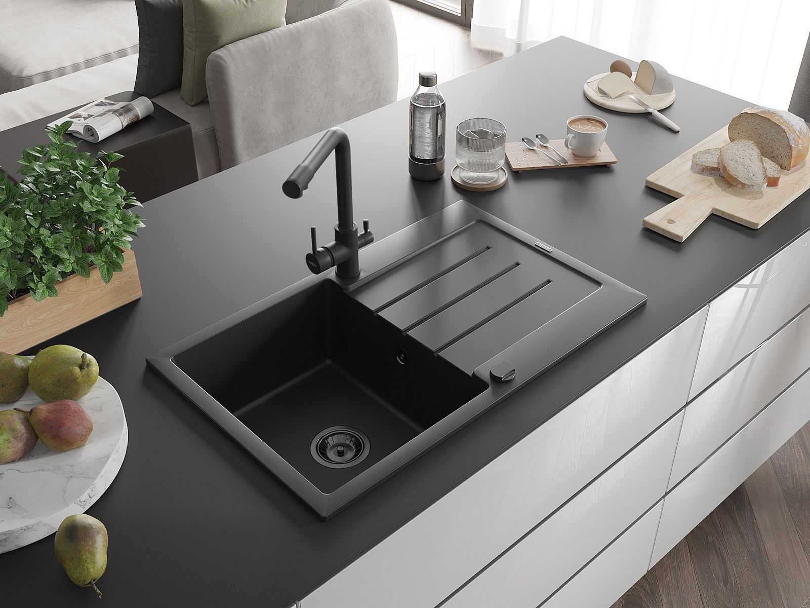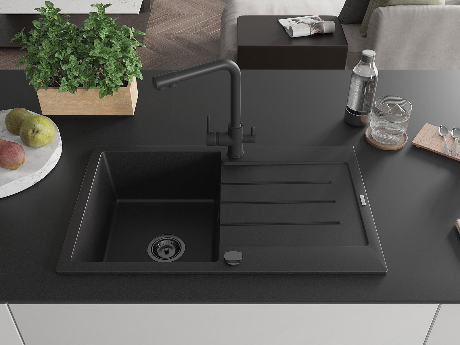 The sink is made of high quality granite. It is an elegant and, above all, practical complement to every kitchen, regardless of its style. High quality and granite durability ensure many years of use.