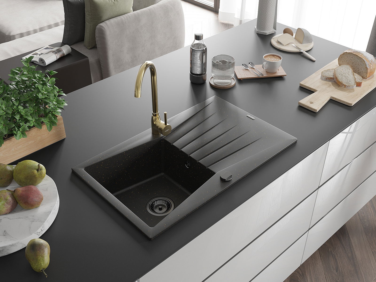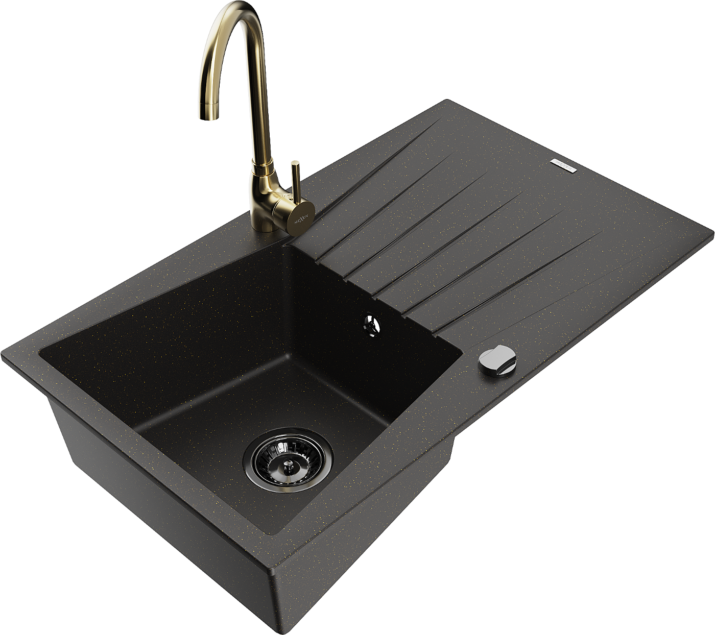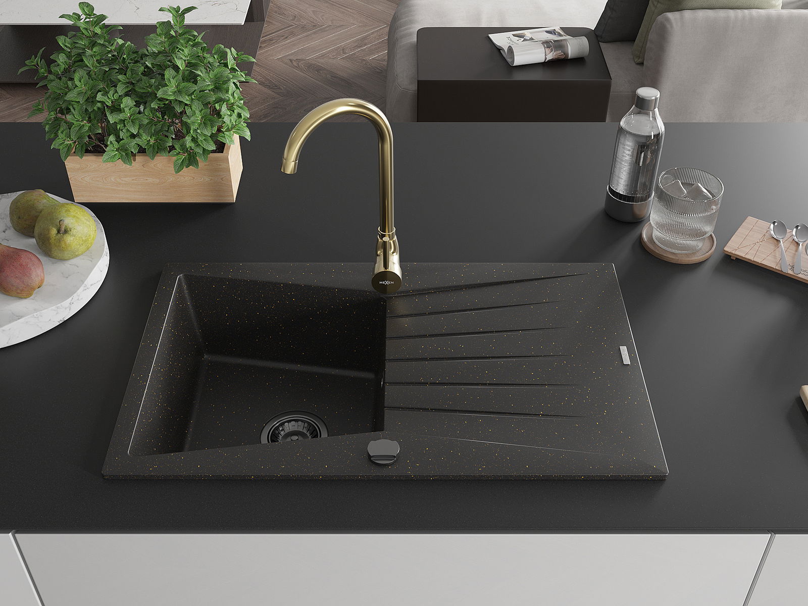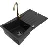 Mexen Cesar granite sink 1-bowl with drainer and Telma kitchen tap, black/gold - 6514-75-670200-50-B