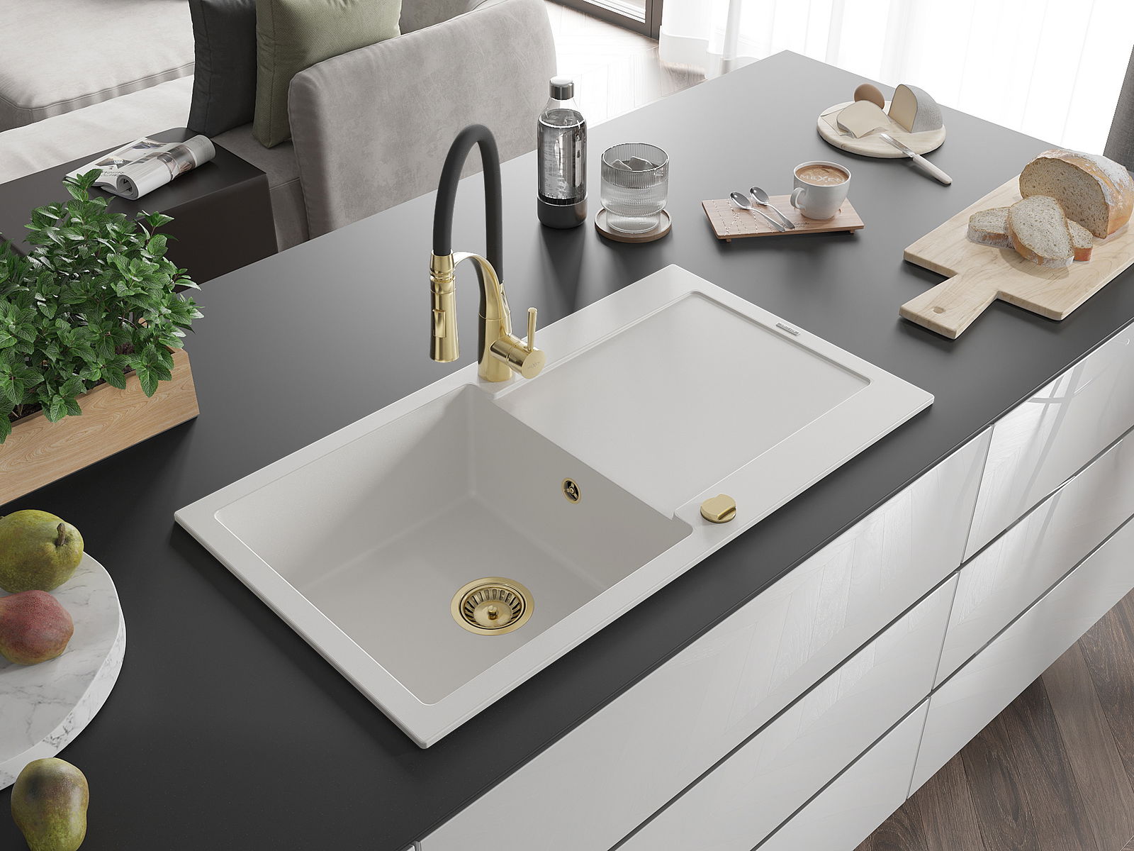 The sink is made of high quality granite. It is an elegant and, above all, practical complement to every kitchen, regardless of its style. High quality and granite durability ensure many years of use.