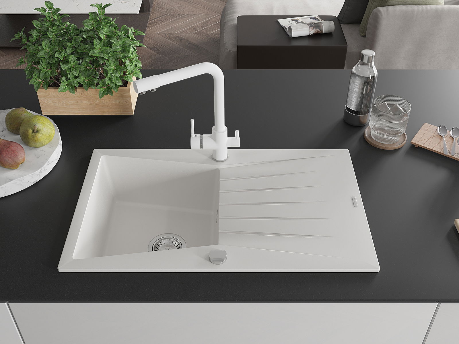 Mexen Cesar 1-bowl granite sink with drainer and Duero kitchen tap, white - 6514-20-671600-20