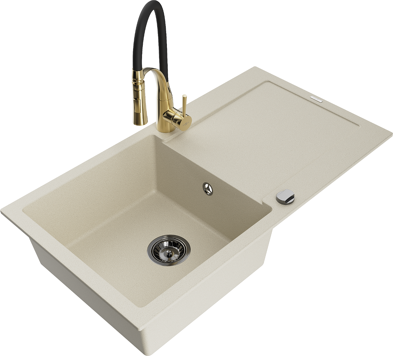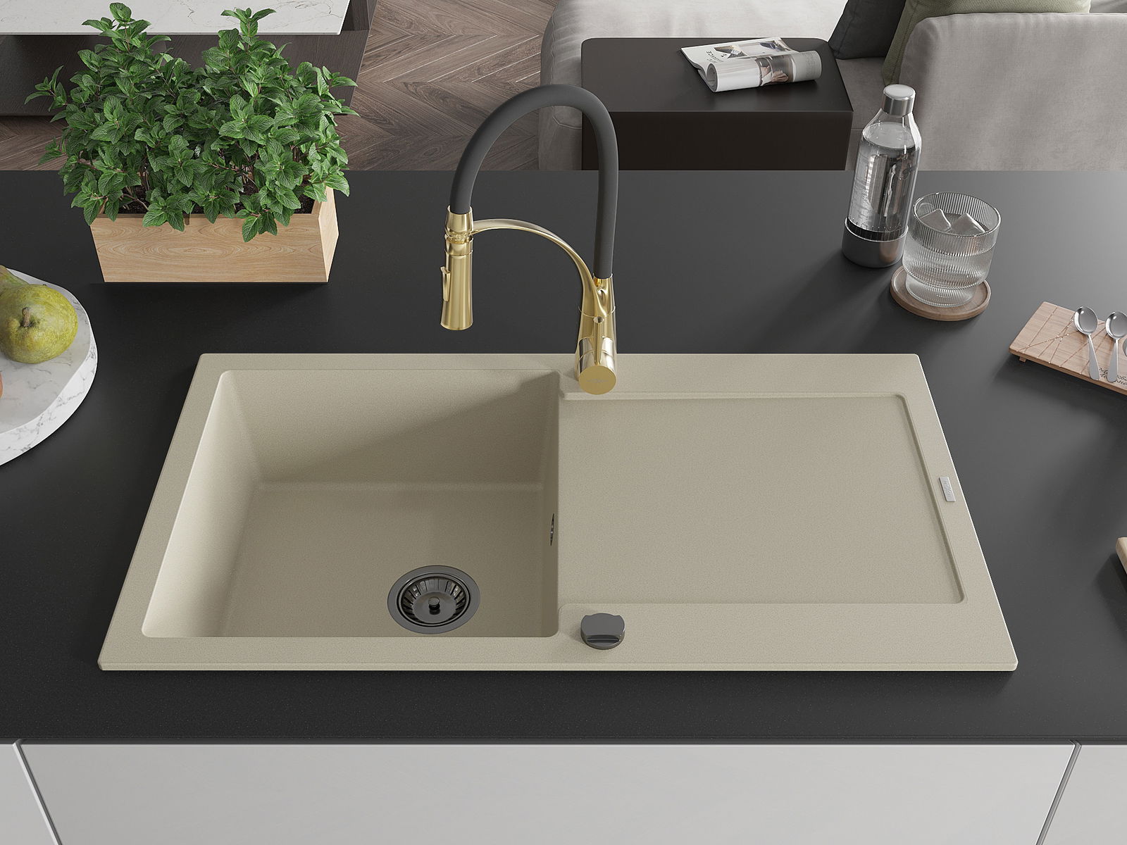 Mexen Leo granite kitchen sink 1-bowl with drainer and Aster kitchen tap, beige - 6501-69-73450-57-B