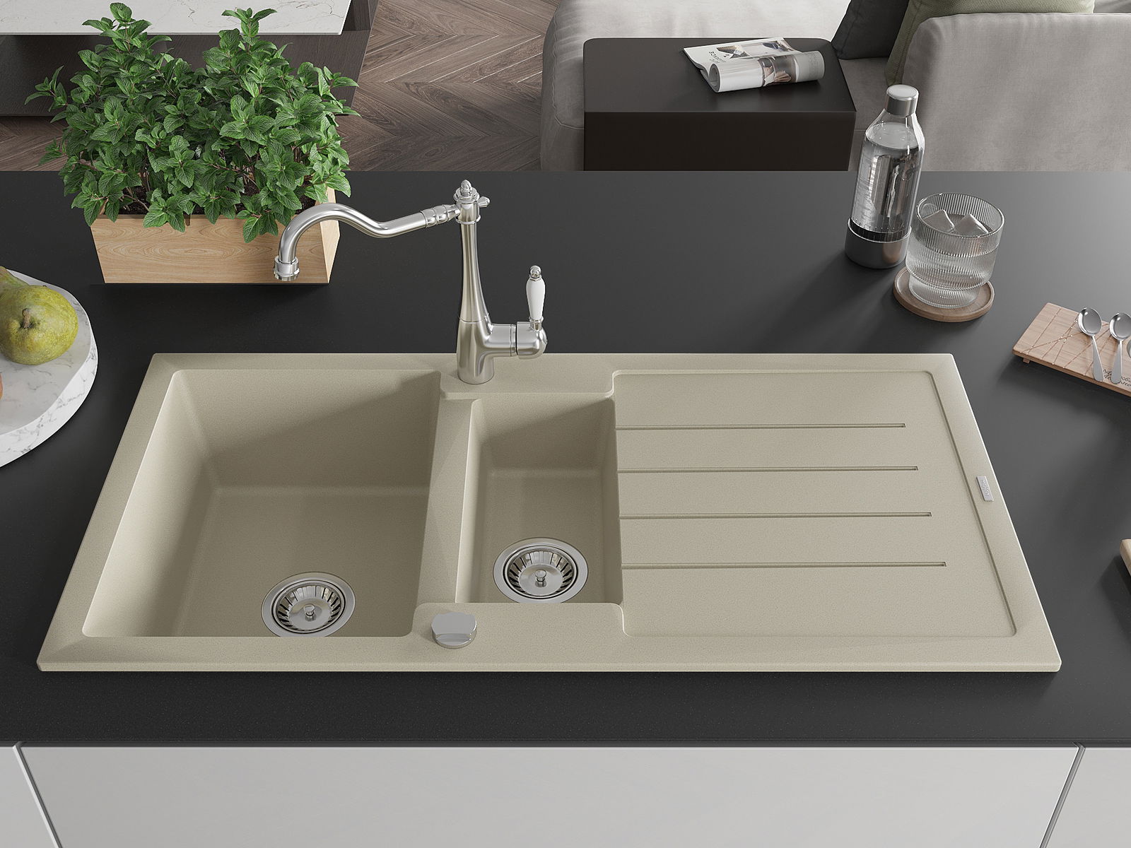 The sink is made of high quality granite. It is an elegant and, above all, practical complement to every kitchen, regardless of its style. High quality and granite durability ensure many years of use.