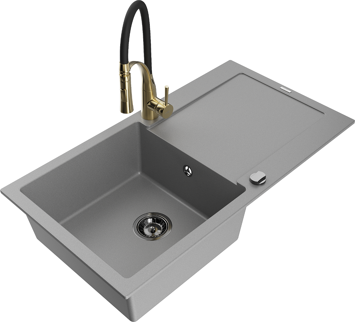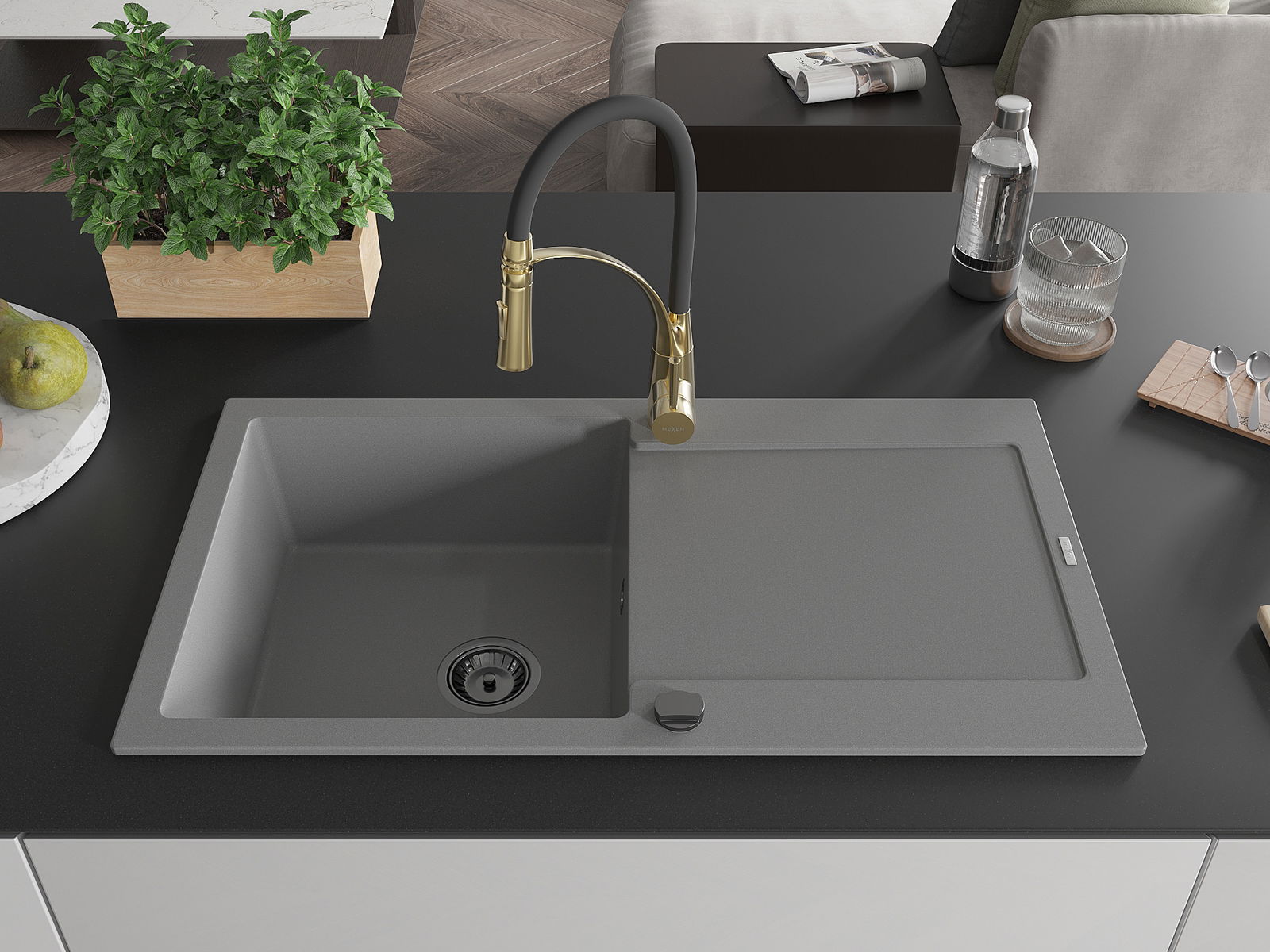 Mexen Leo 1-bowl granite sink with drainer and Aster kitchen tap, grey - 6501-71-73450-57-B