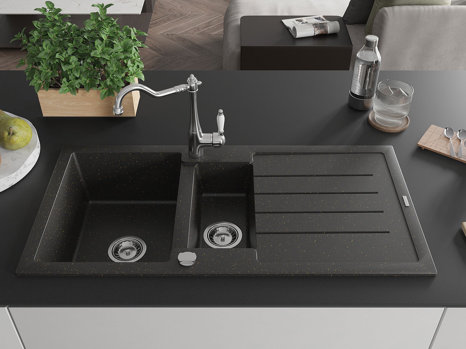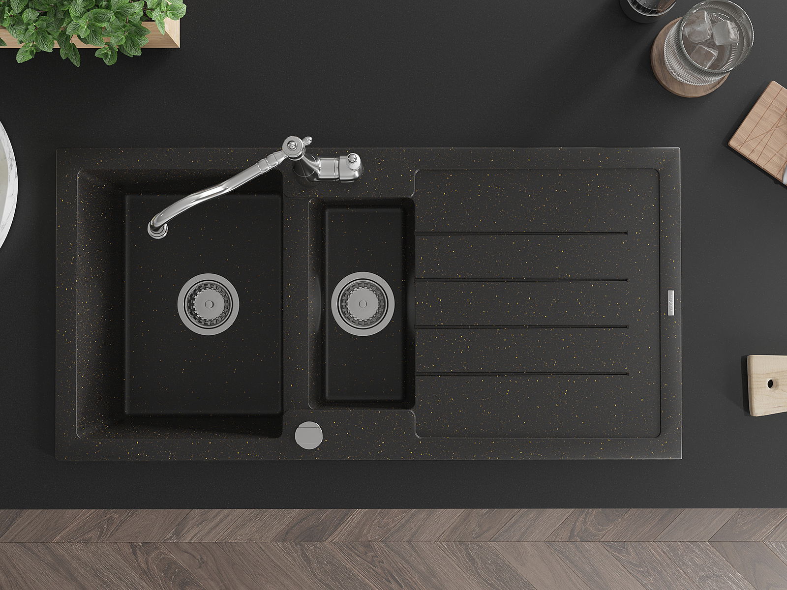 The sink is made of high quality granite. It is an elegant and, above all, practical complement to every kitchen, regardless of its style. High quality and granite durability ensure many years of use.