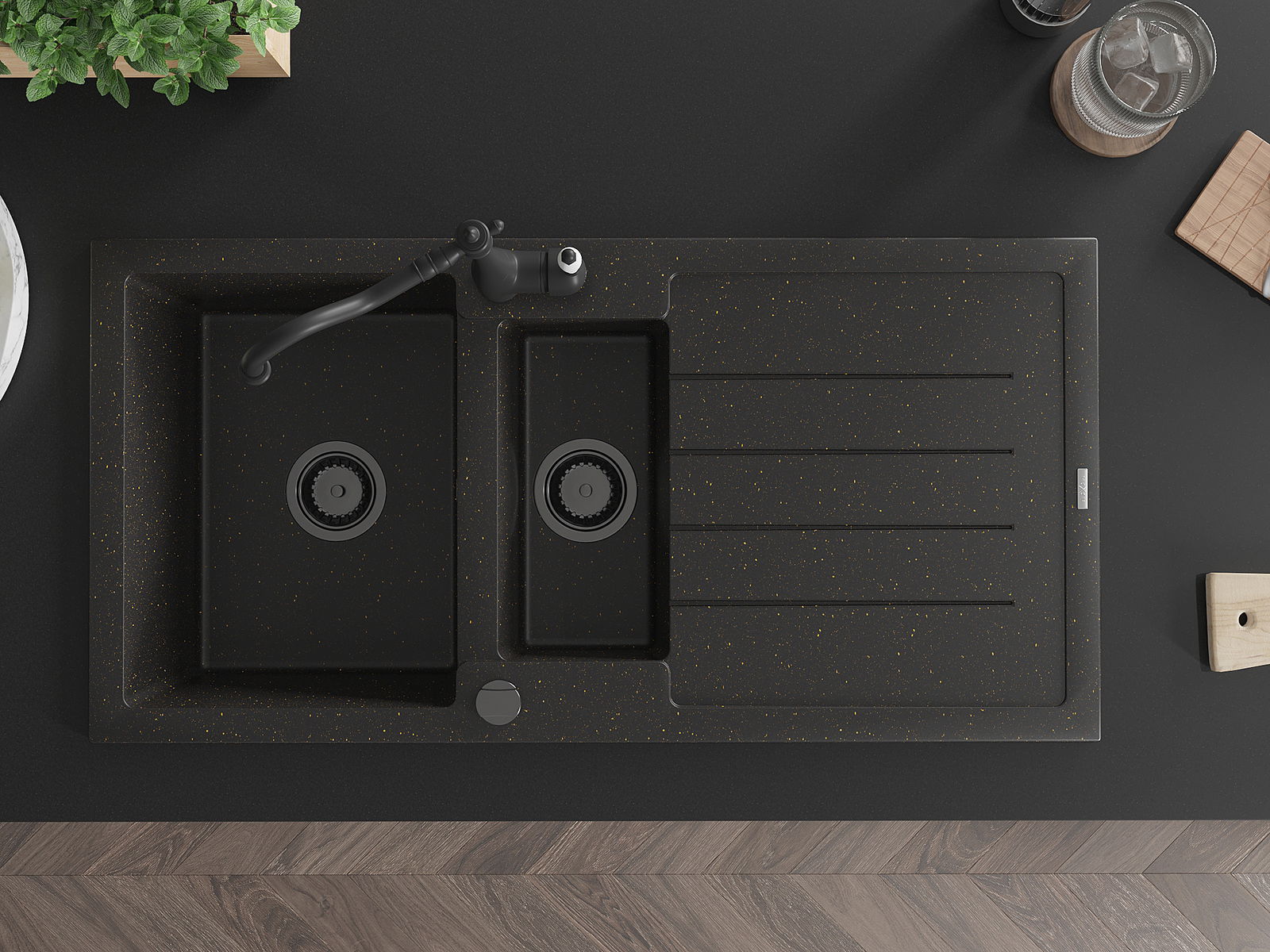 Mexen Andres granite sink with 1.5-bowl, drainer and Carla kitchen tap, black/gold - 6515-75-670700-70-B