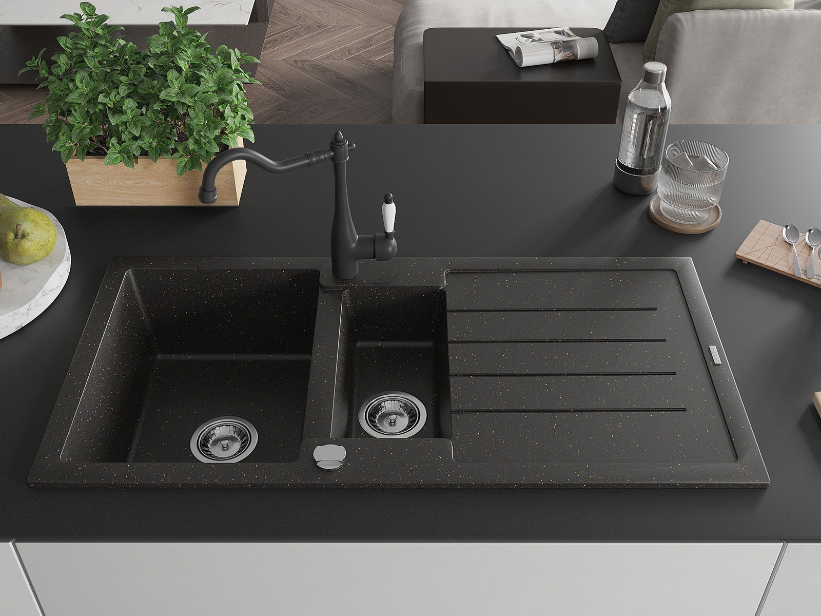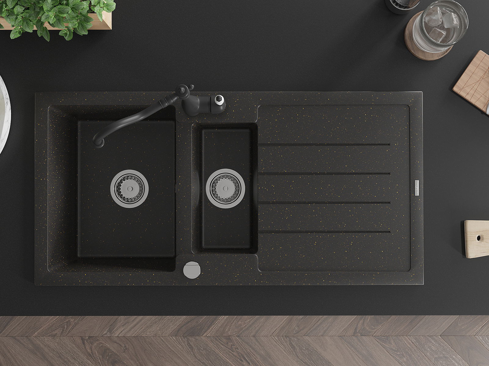 Mexen Andres granite sink 1.5-bowl with drainer and Carla kitchen tap, black/gold - 6515-75-670700-70