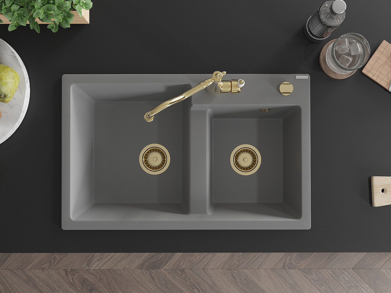Mexen Tomas granite sink 2-chamber with Carla kitchen tap, grey - 6516-71-670700-50
