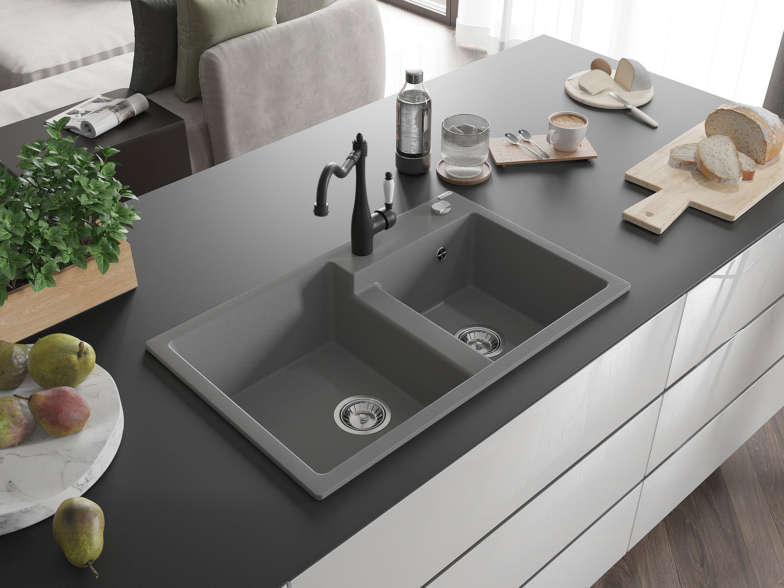 The sink is made of high quality granite. It is an elegant and, above all, practical complement to every kitchen, regardless of its style. High quality and granite durability ensure many years of use.