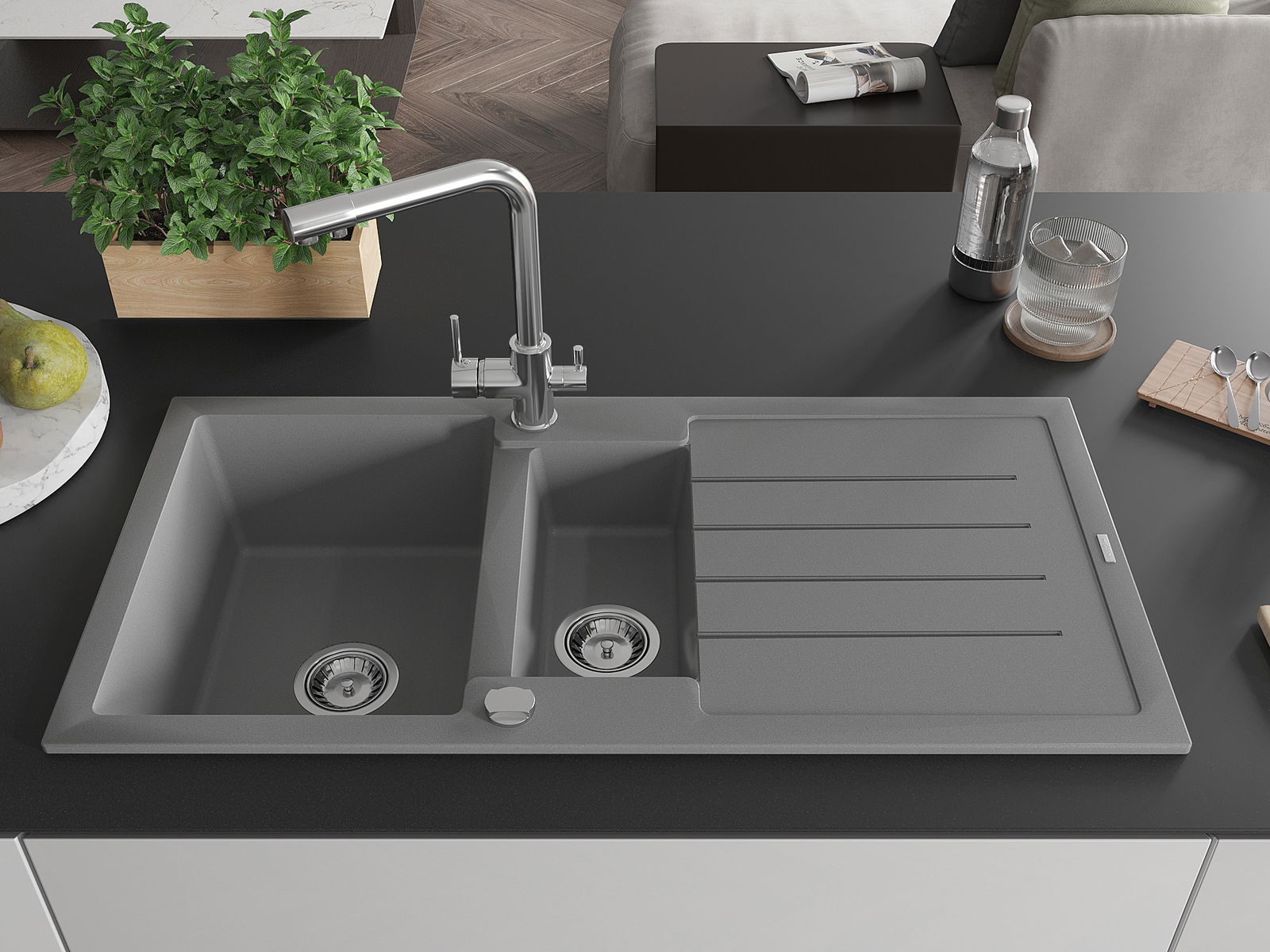 The sink is made of high quality granite. It is an elegant and, above all, practical complement to every kitchen, regardless of its style. High quality and granite durability ensure many years of use.