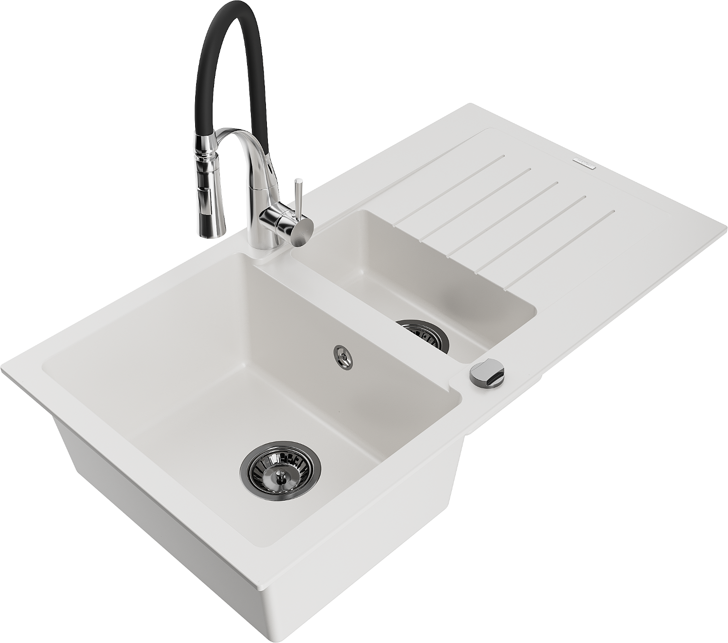 Mexen Matias granite sink 1.5-bowl with drainer and Aster kitchen tap, white - 6502-20-73450-07-B