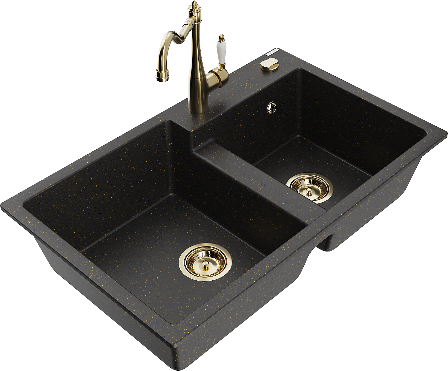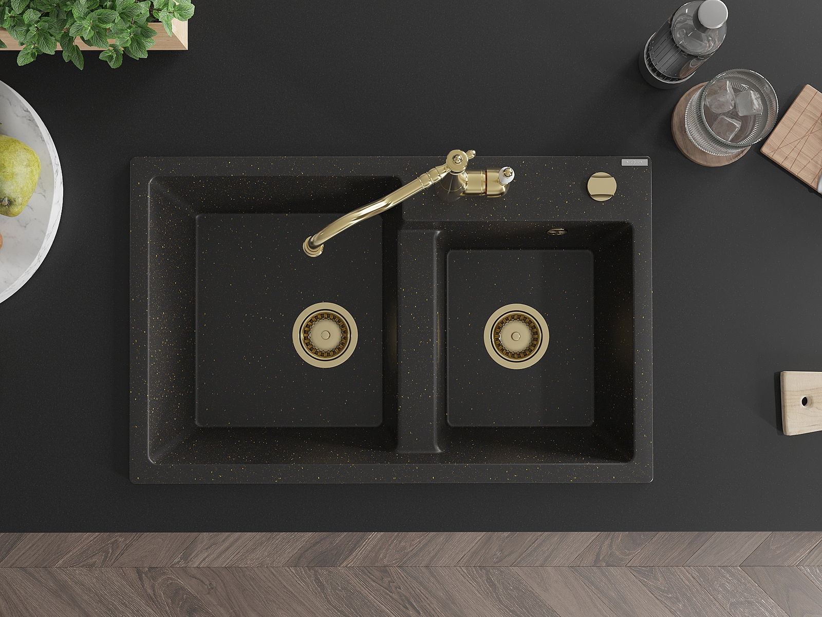 Mexen Tomas granite sink 2-bowl with Carla kitchen tap, black/gold metallic - 6516-75-670700-50