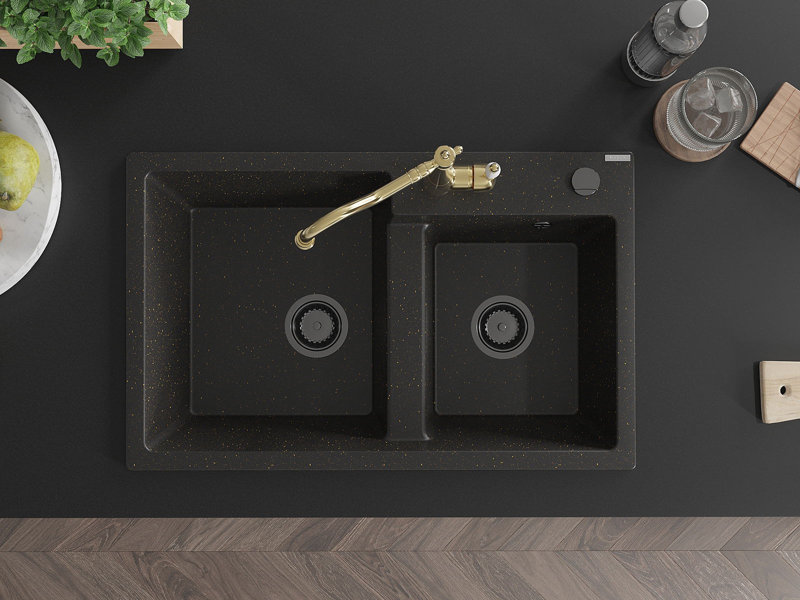 Mexen Tomas granite sink 2-chamber with Carla kitchen tap, black/gold metallic - 6516-75-670700-50-B