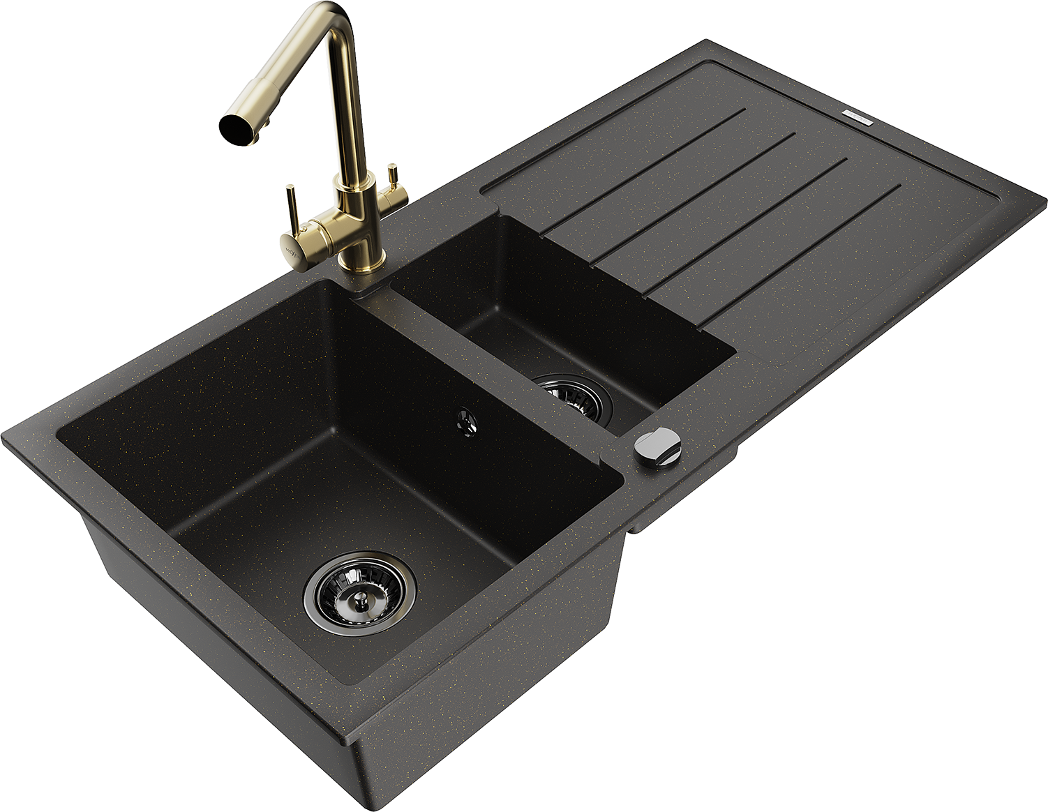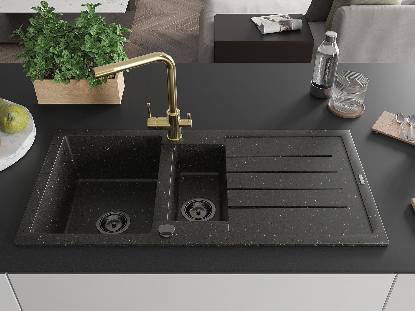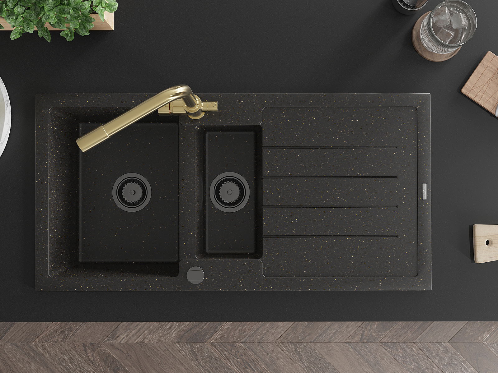 Mexen Andres 1.5-bowl granite sink with drainer and Duero kitchen tap, black/gold - 6515-75-671600-50-B