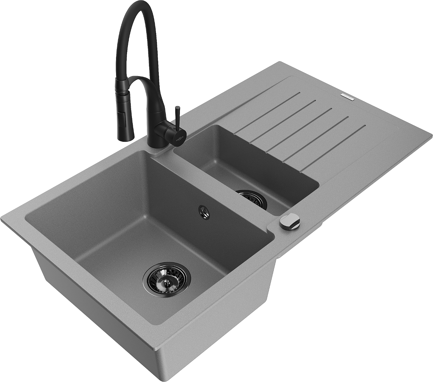 Mexen Matias granite sink 1.5-bowl with drainer and Aster kitchen tap, grey - 6502-71-73450-70-B