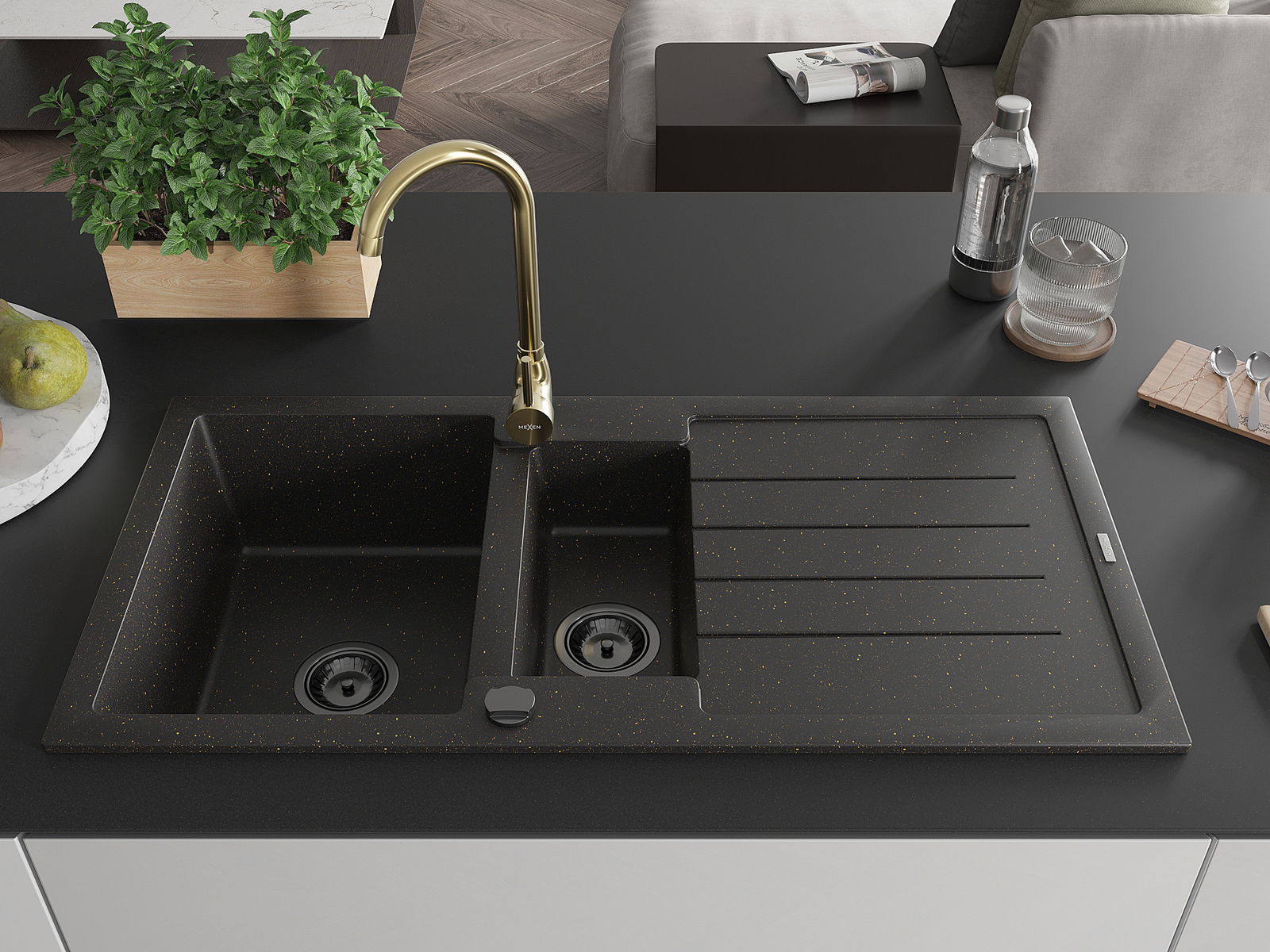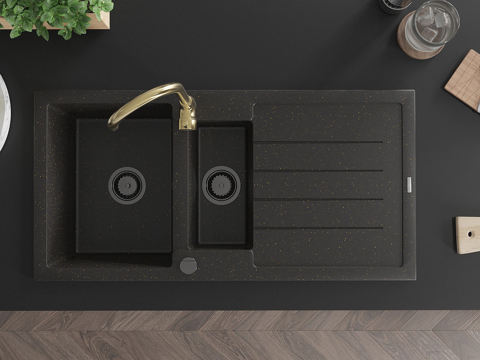 Mexen Andres 1.5-bowl granite sink with drainer and Telma kitchen tap, black/gold - 6515-75-670200-50-B