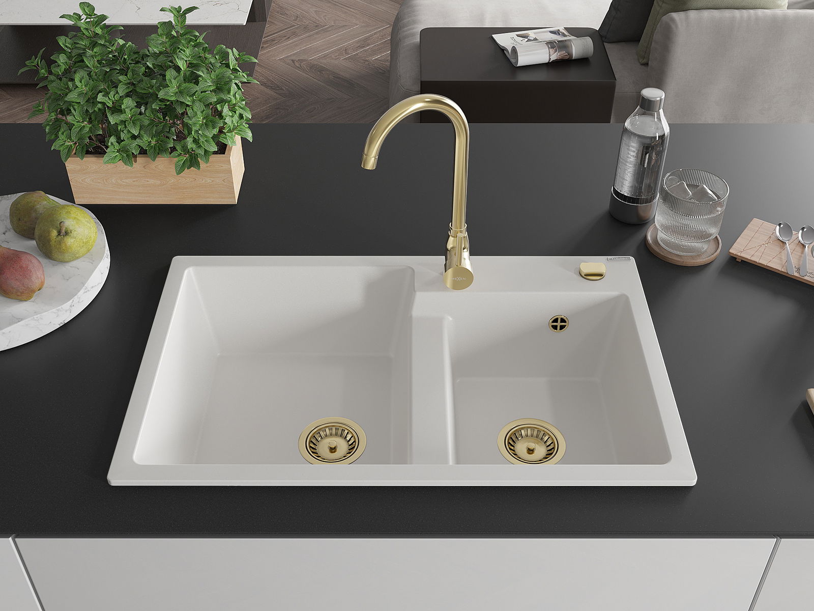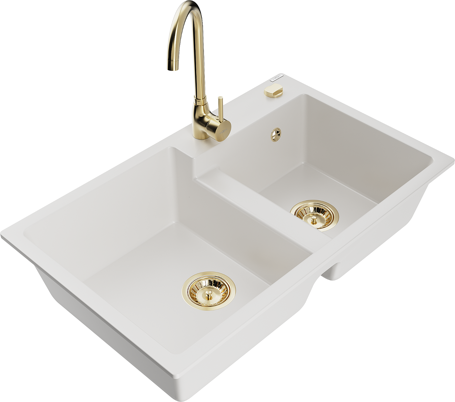 Mexen Tomas granite sink 2-bowl with Telma kitchen tap, white - 6516-20-670200-50