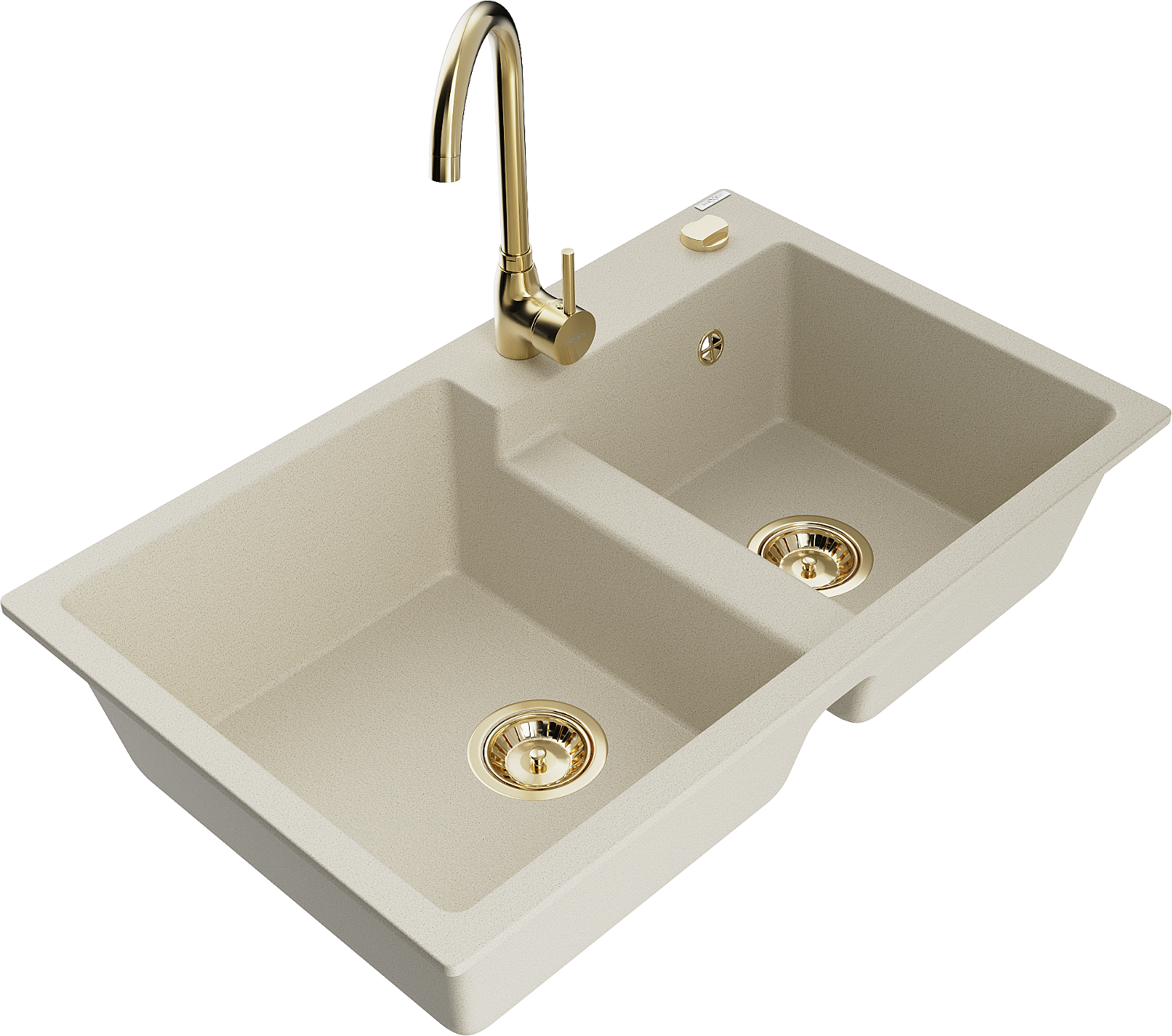 Mexen Tomas Granite Sink 2-Bowl with Telma Kitchen Tap, Beige - 6516-69-670200-50