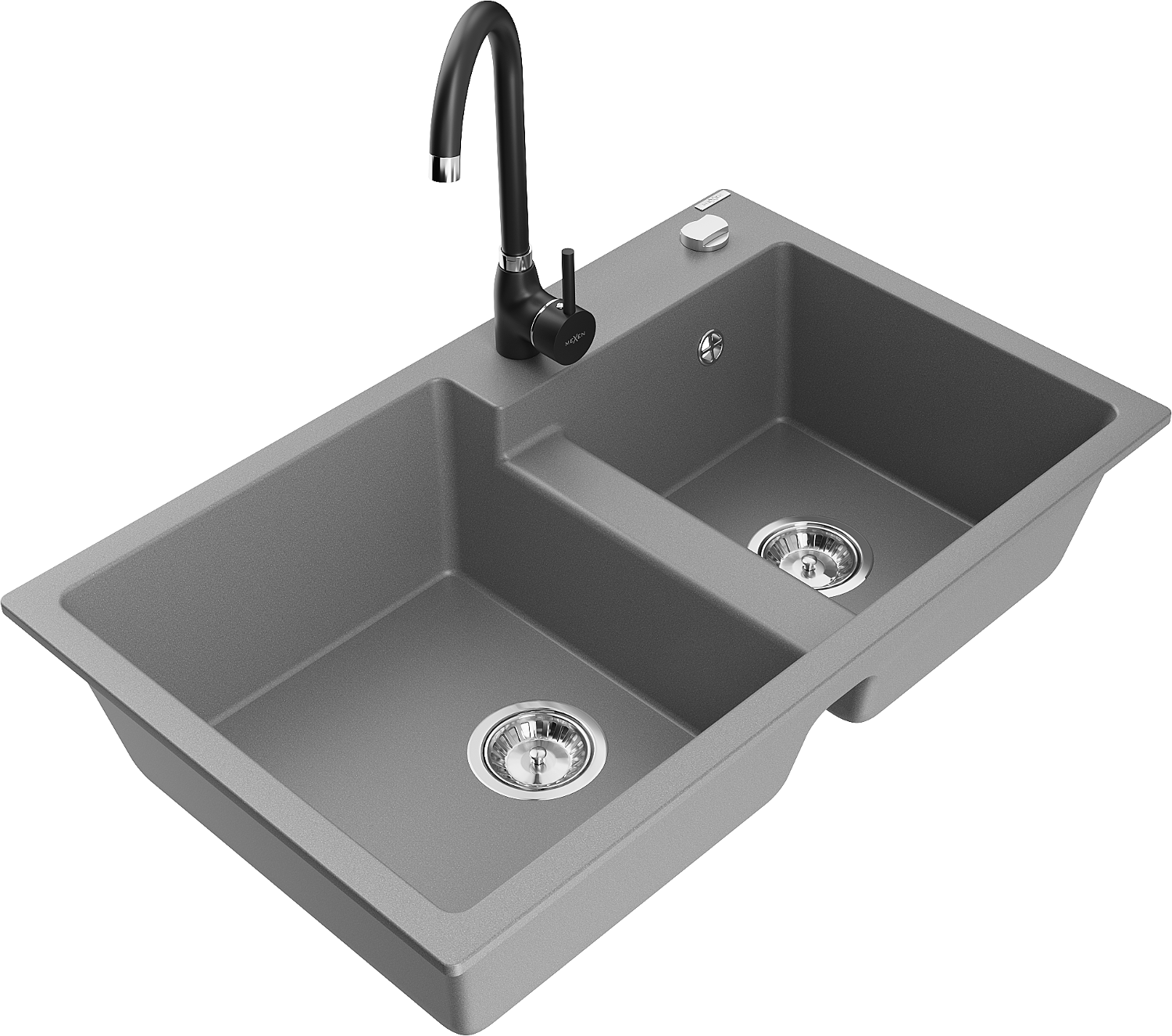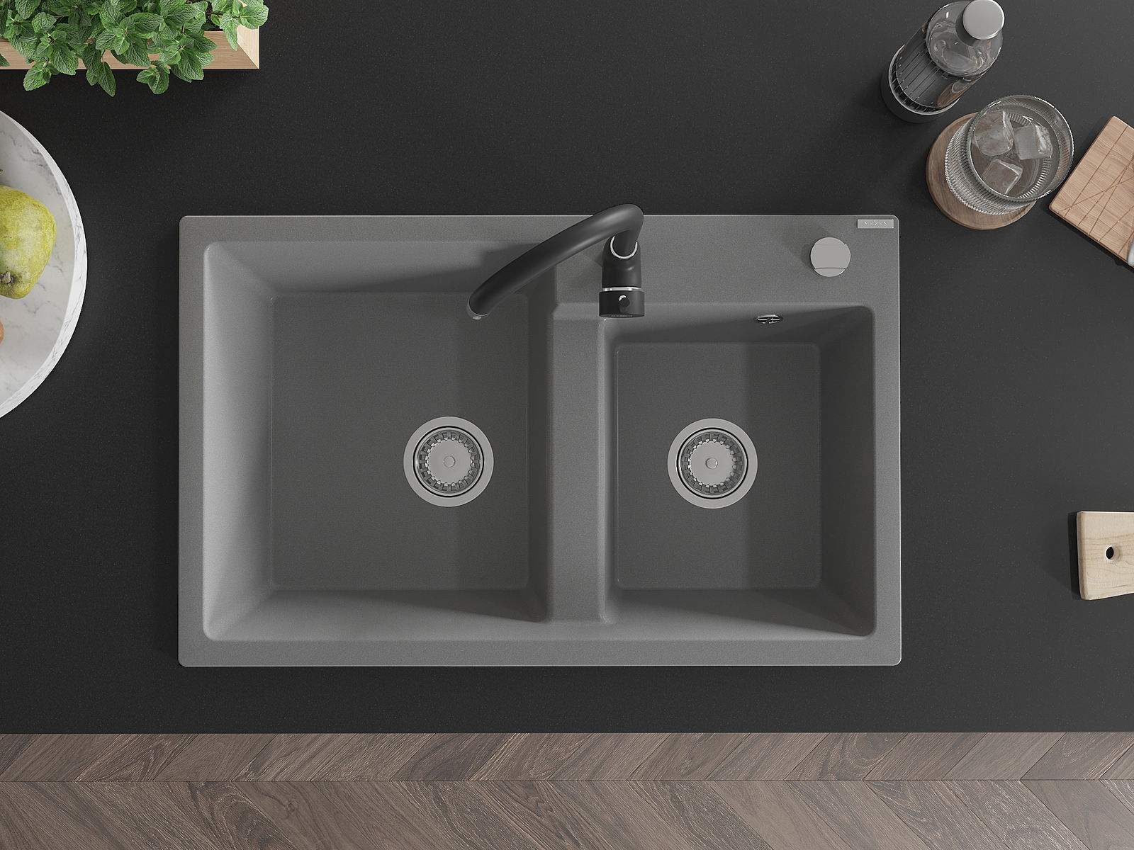 Mexen Tomas granite sink 2-bowl with Telma kitchen tap, grey - 6516-71-670200-70