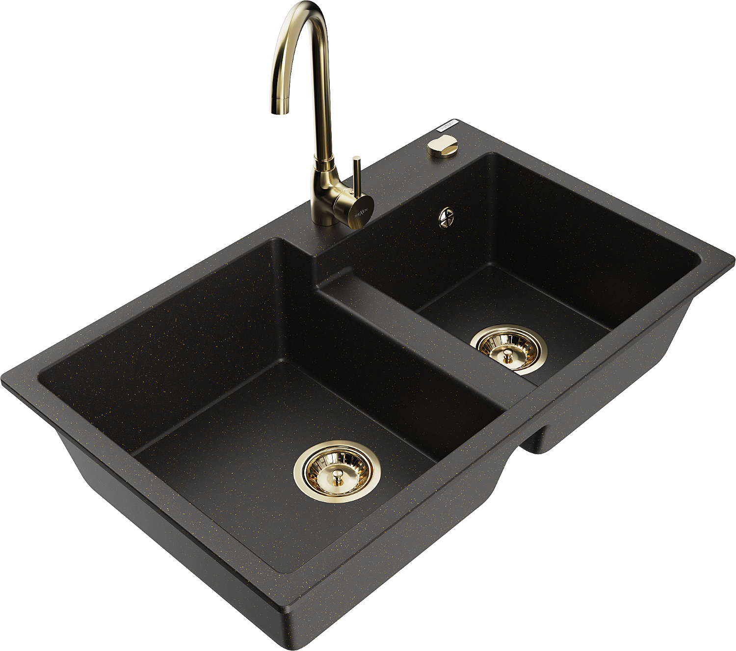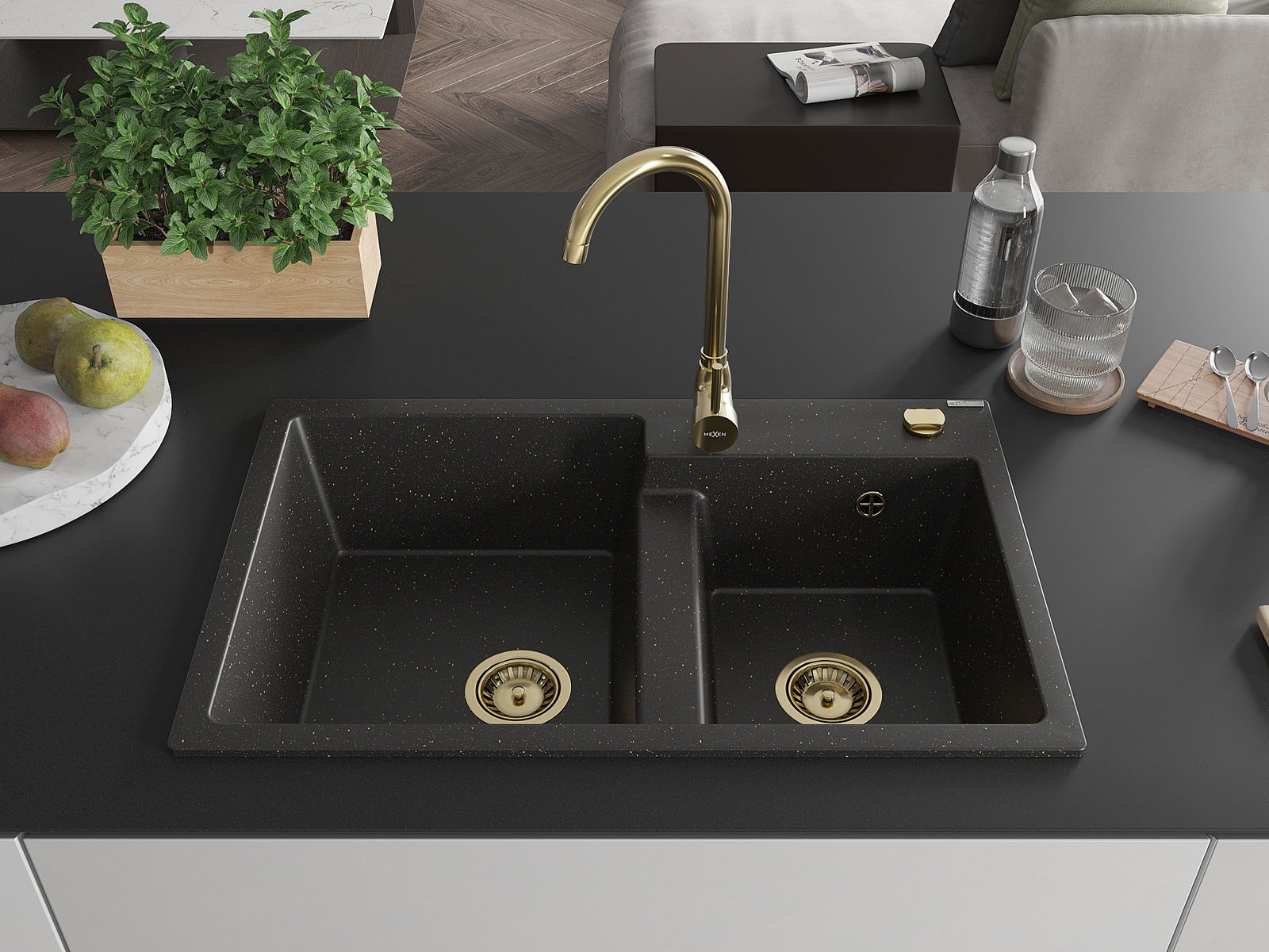 Mexen Tomas granite kitchen sink with 2 bowls and Telma kitchen tap, black/gold metallic - 6516-75-670200-50